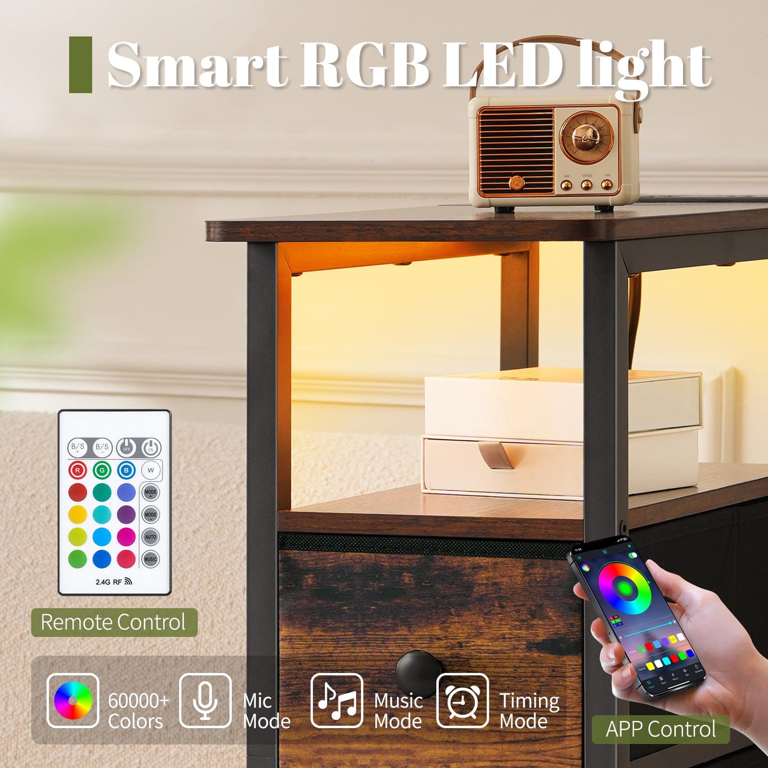 - LED Bedroom Dresser with Charging Station: Our chest of drawers for bedroom with 2 AC outlets and 2 USB ports keeps your devices charged and ready for action. Moreover, you can set the mood with the LED strip's over 60000 colors, 29 fun lighting modes, and music sync. Control it all with the app or remote and set timers for added ease. Style meets function—what's not to love?
