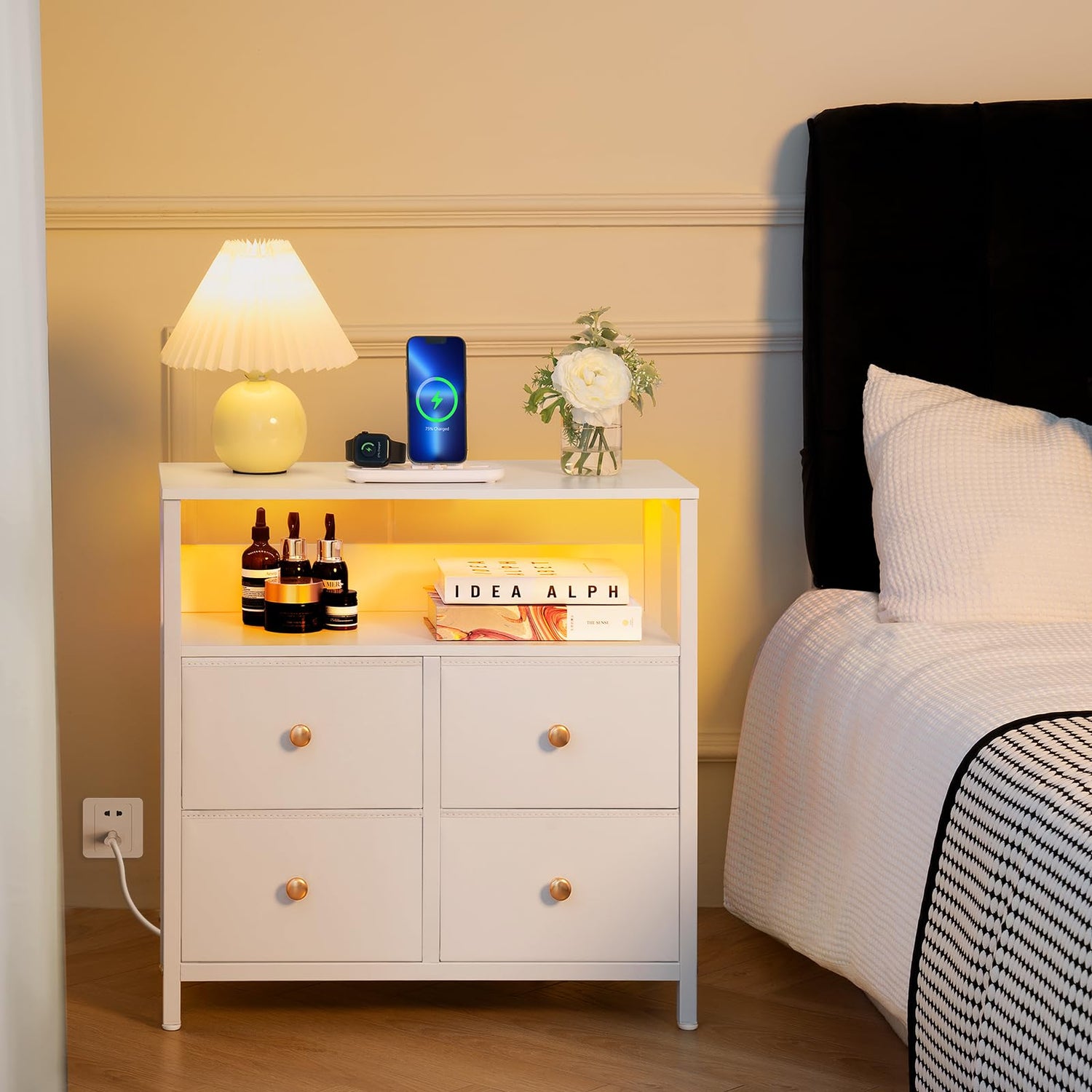 - 【Nightstand with Charging Station】The white nightstand with 2 outlets & 2 USB ports, allowing you to use multiple plugs simultaneously to meet your charging needs fully. The extra hidden USB port powers LED light, freeing up USB ports for more important. Experience the convenience of extended reach with a 6.56ft cord for the small nightstand—ideal for any room setup.