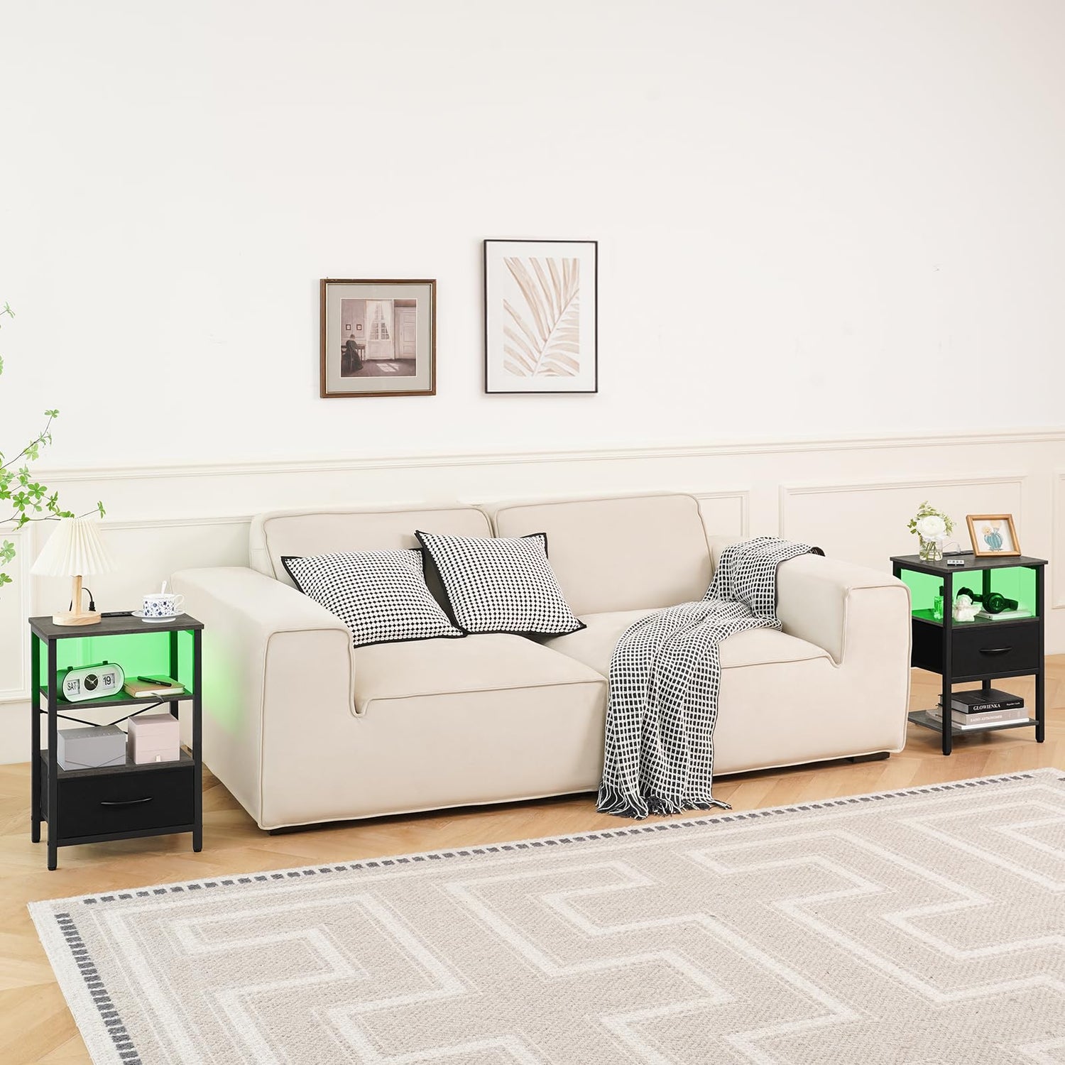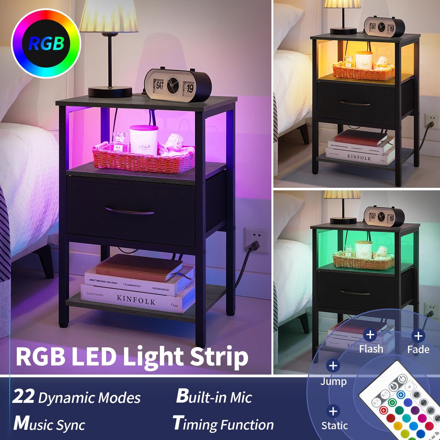 Yoobure Night Stand with Charging Station, LED Nightstand for Bedroom, Bedside Table with Adjustable Fabric Drawer, 3-Tier End Table Living Room, Small Side Table with Storage, Grey