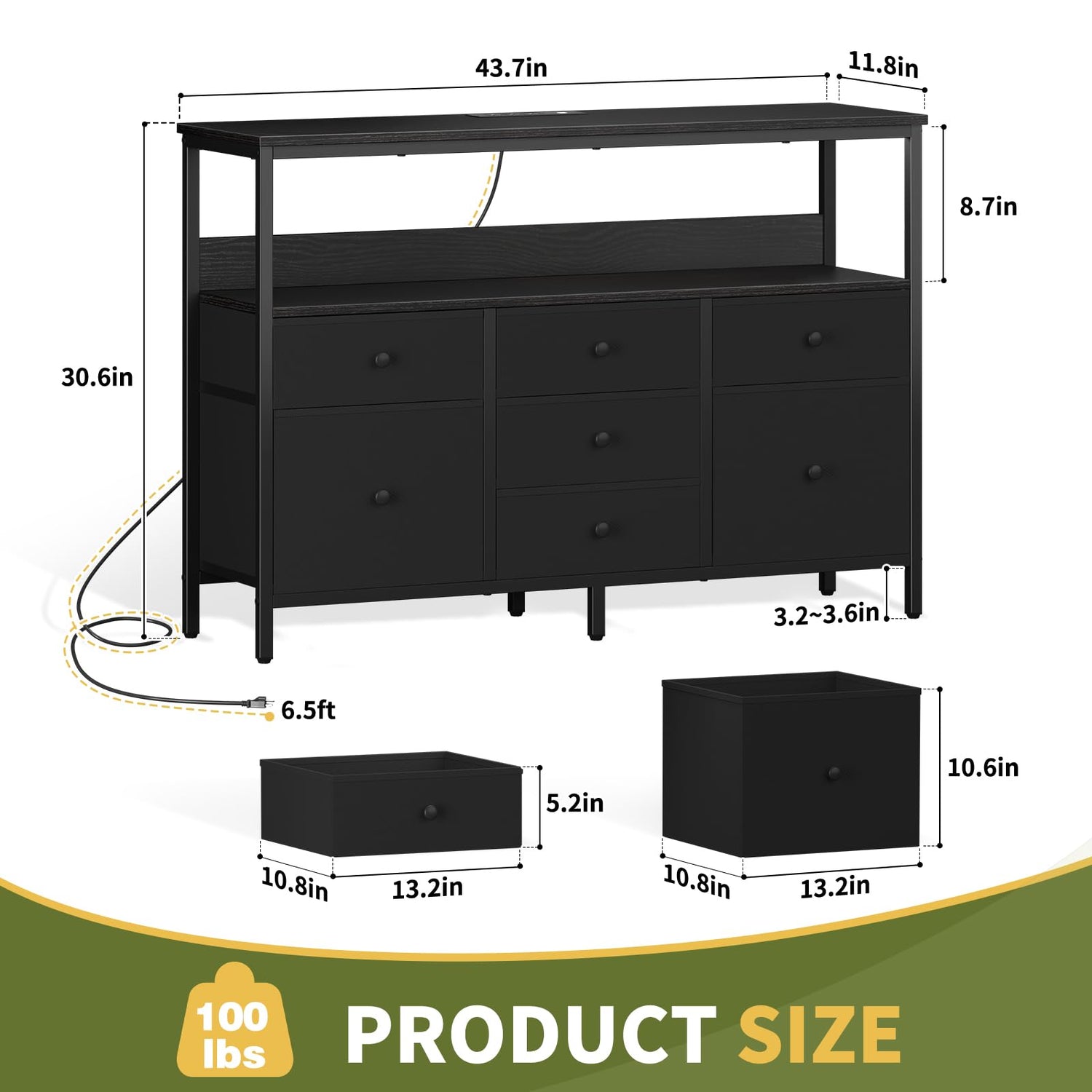 - Ample Storage/Display Space: The TV stand with storage has a roomy 43.7"L x 11.8"W tabletop to house TVs up to 50" easily. 2 different sizes 7 fabric drawers and an open shelf with a backing panel provide ample classified storage for CDs, decorative items, T-shirts, blankets, toys, etc, to keep your room organized. Yoobure small dresser will be an awesome home companion