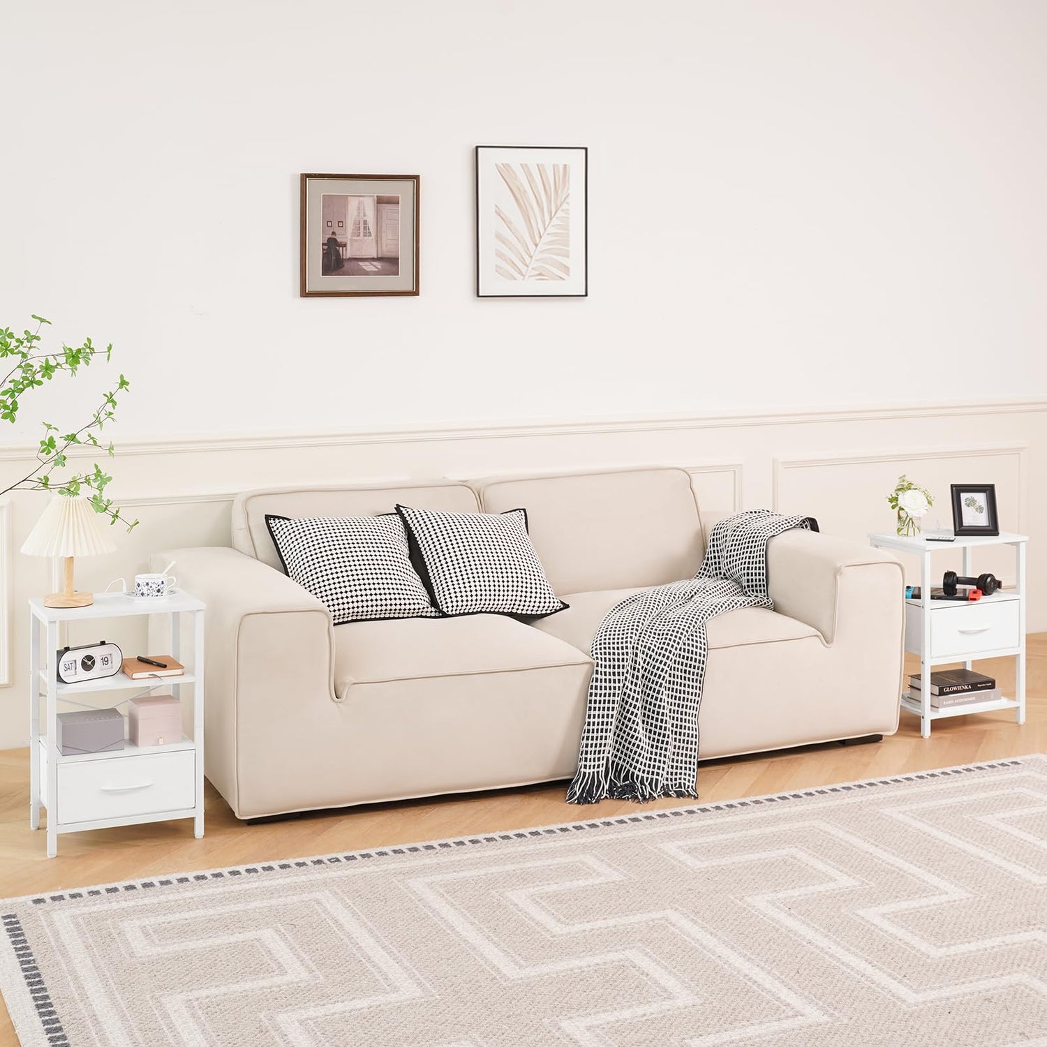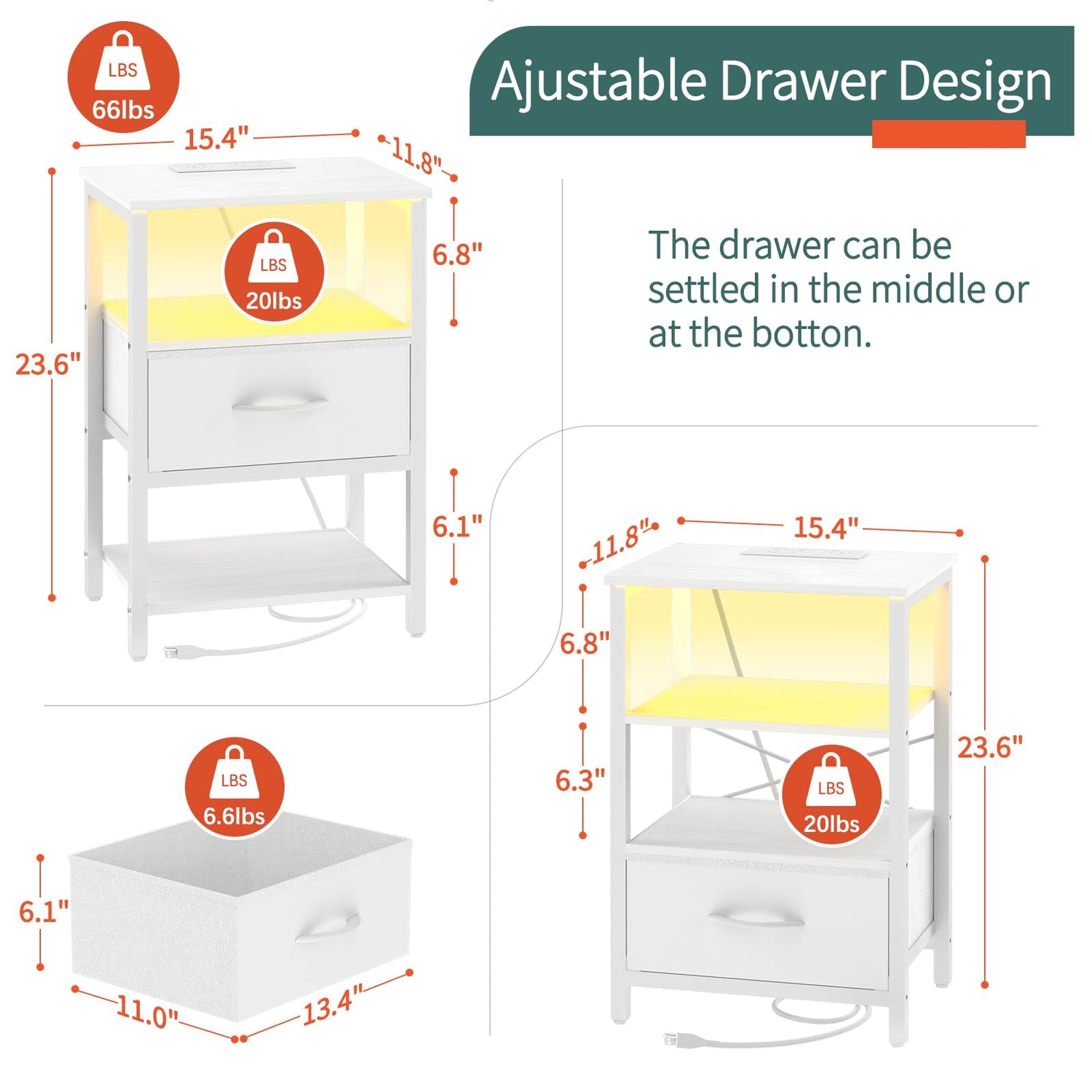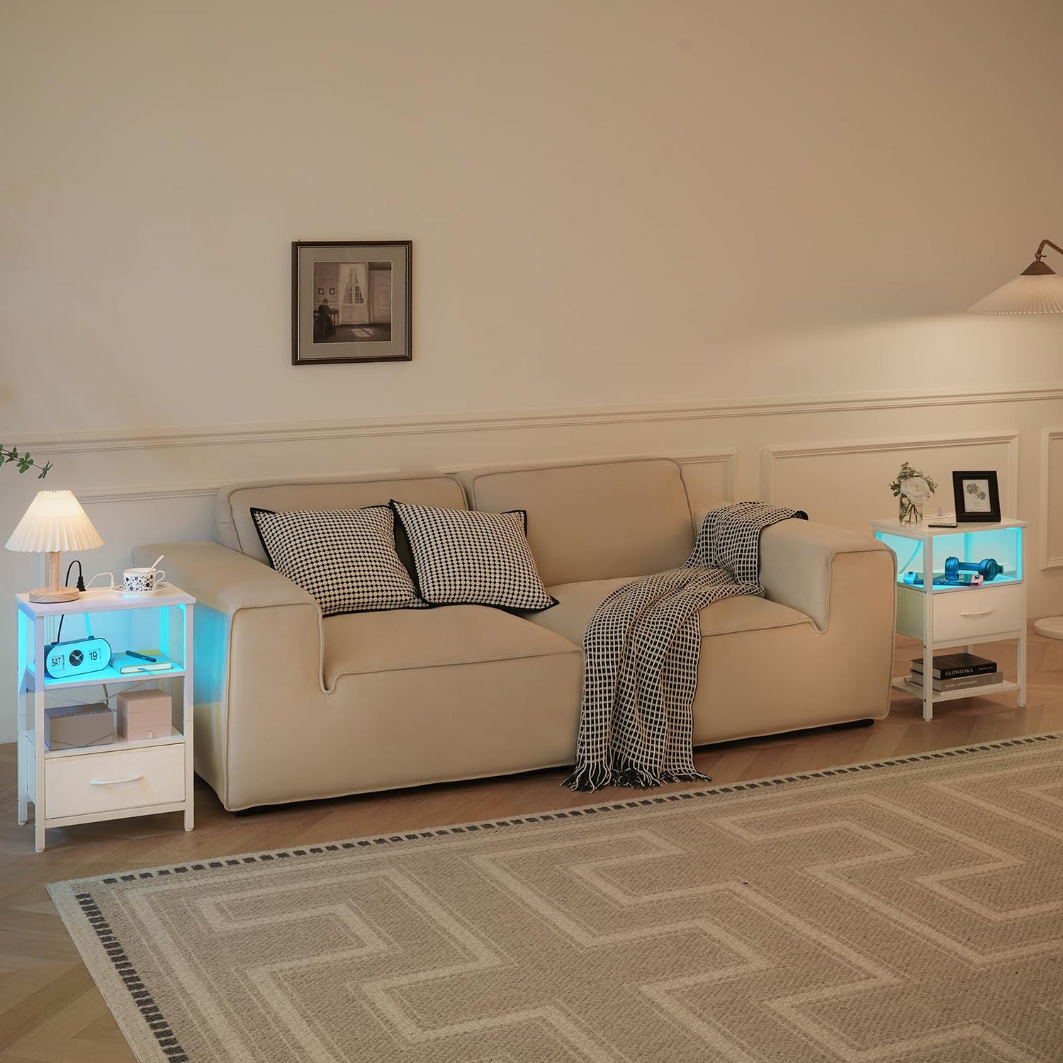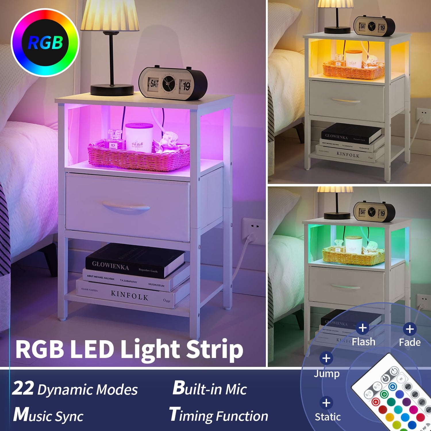 Yoobure White Night Stand with Charging Station, LED Nightstand for Bedroom, Bedside Tables with Adjustable Fabric Drawer, 3-Tier End Table Living Room, Small Side Table with Storage