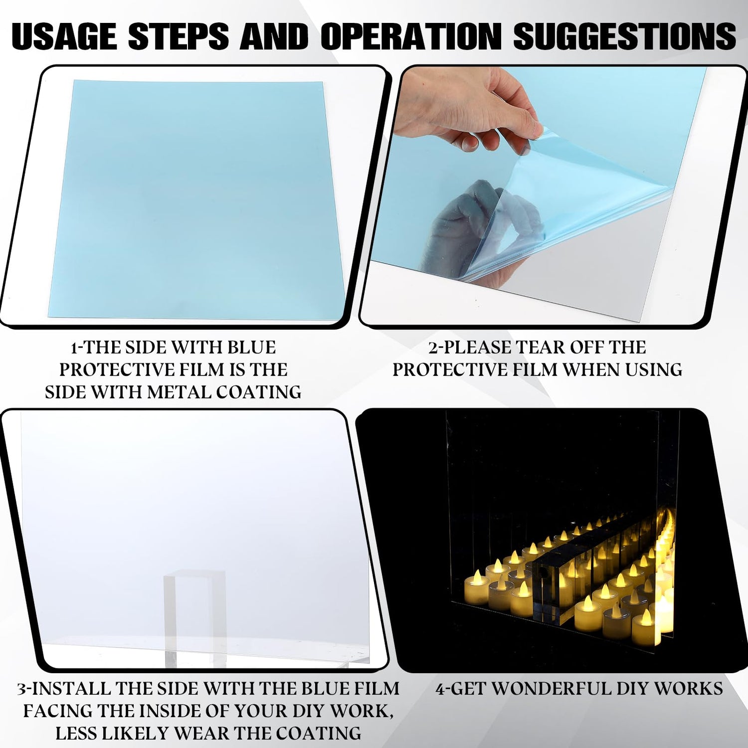 - Instructions: please tear off the protective film on both sides before use; The side with the blue protective film is the side with the metal coating; We recommend that you install the side with the blue protective film facing the inside of your DIY work, so that it is less likely to wear the coating; If the coating is broken, the special reflection effect will be invalid; The protective film may be scratched, but the infinity mirror is generally safe and scratch free