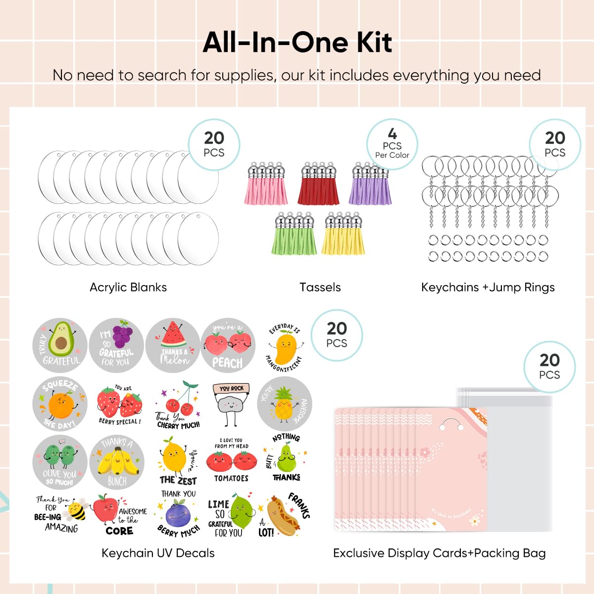 - 【140 PCS Acrylic Keychain Blank Kits】Acrylic keychain blank bulks come with 20pcs clear acrylic blanks (2 inches), 20 pcs fruit theme uv dtf wrap stickers, 20cs keyring with chain, 20pcs jump rings, 20pcs colorful keychain tassels, 20pcs keychain display cards and 20pcs packing bag