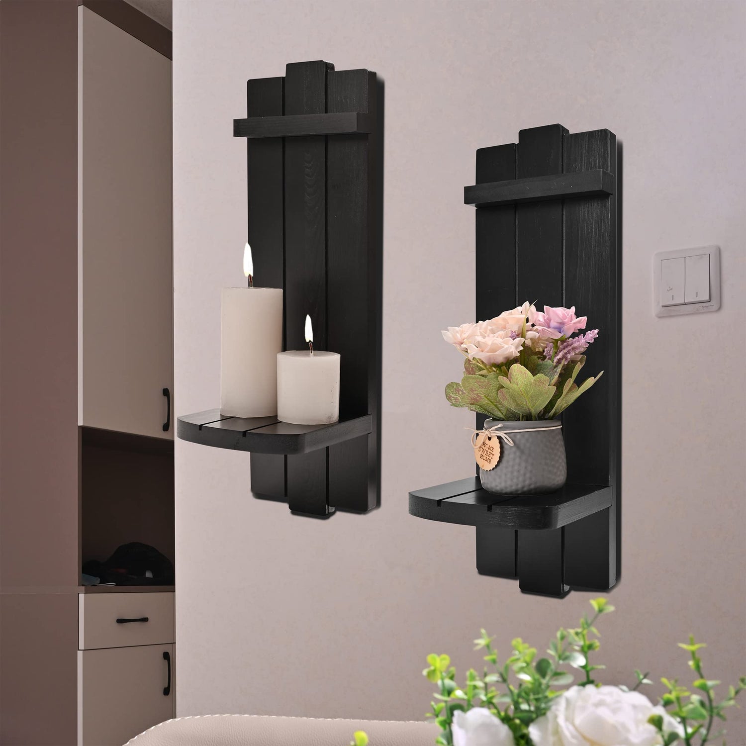 - 【Premium Material】Our wooden wall candle holders are made of 100% premium wood and covered with black paint, with strong corrosion resistance. Each bathroom shelf decor includes a hanging attachment at the back, convenient to hang on the wall.