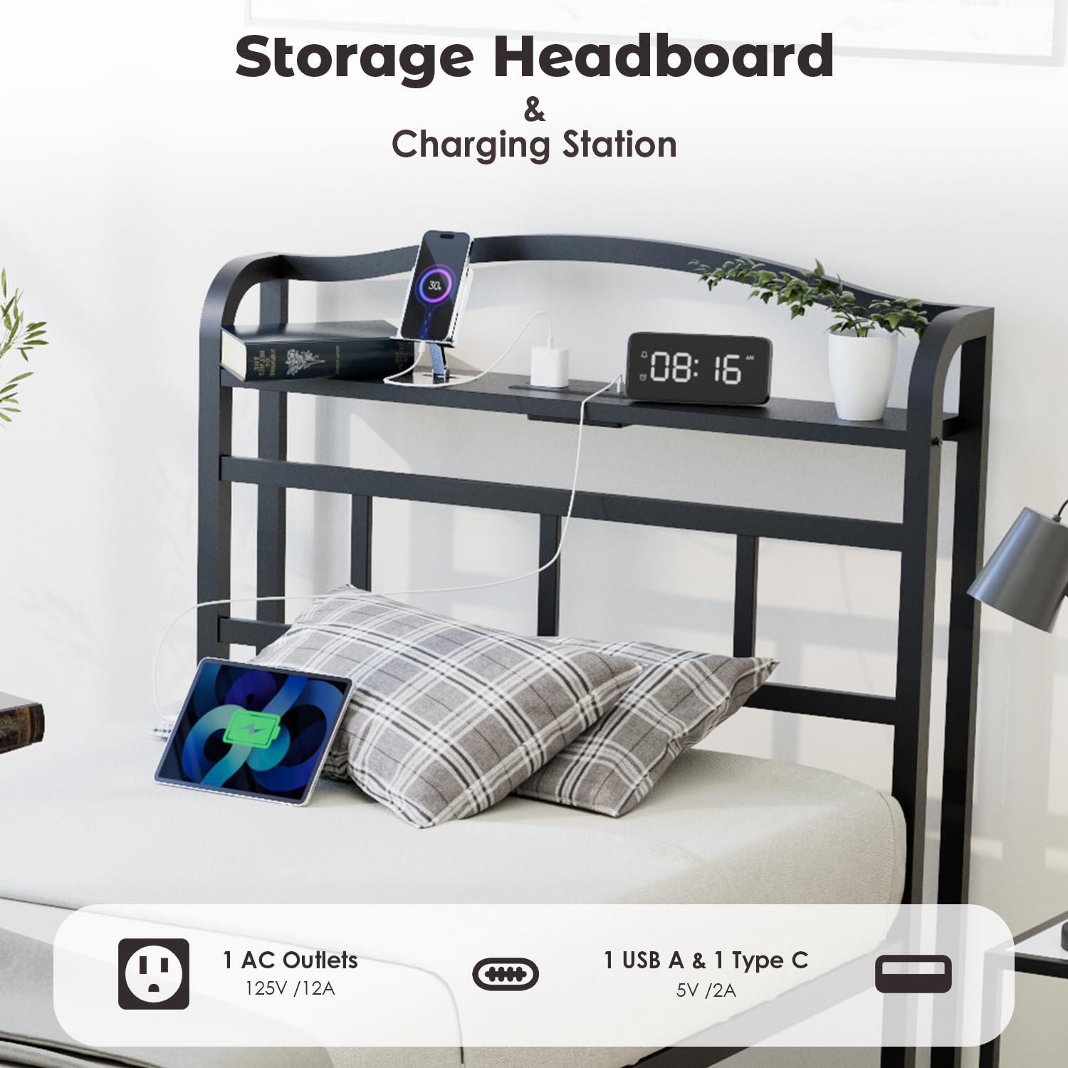 - STORAGE HEADBOARD WITH CHARGING STATION - The headboard of twin size bed frame comes with 1 standard outlet and 2 USB ports (1 USB A + 1 USB C), with cable management 6-foot power cord, allowing you to charge a variety of electronic devices. The wider headboard shelf keeps common items such as cell phones, glasses, clocks, books and more within easy reach.
