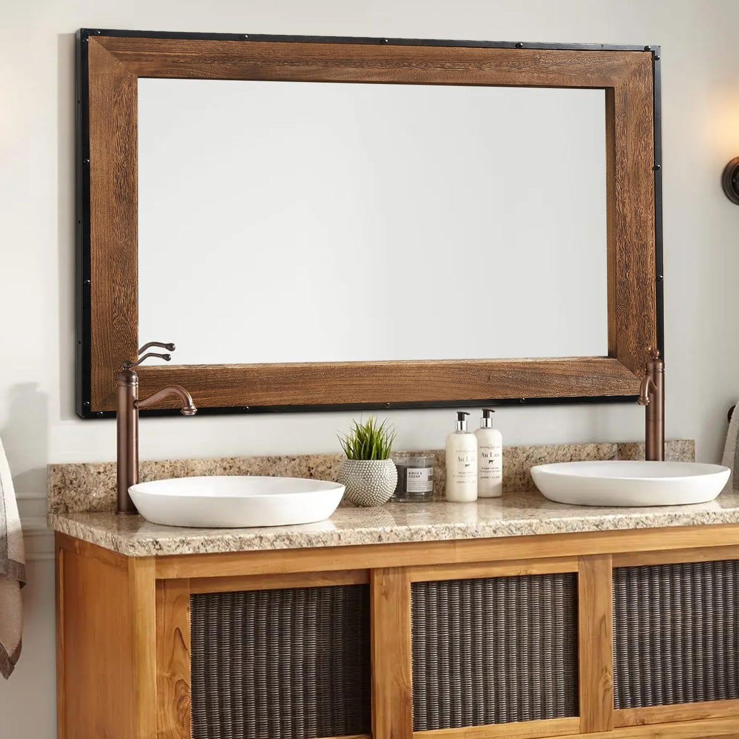 - Farmhouse Rustic Wall Mirror-- This effortlessly elegant accent mirror will brighten your room. The rustic wood-framed wall mirror is the perfect addition to any farmhouse style. The frame of this bathroom mirror has a rectangular shape and is finished in a deep woodgrain. The location of the mirror will mostly rely on the appearance you want to achieve.