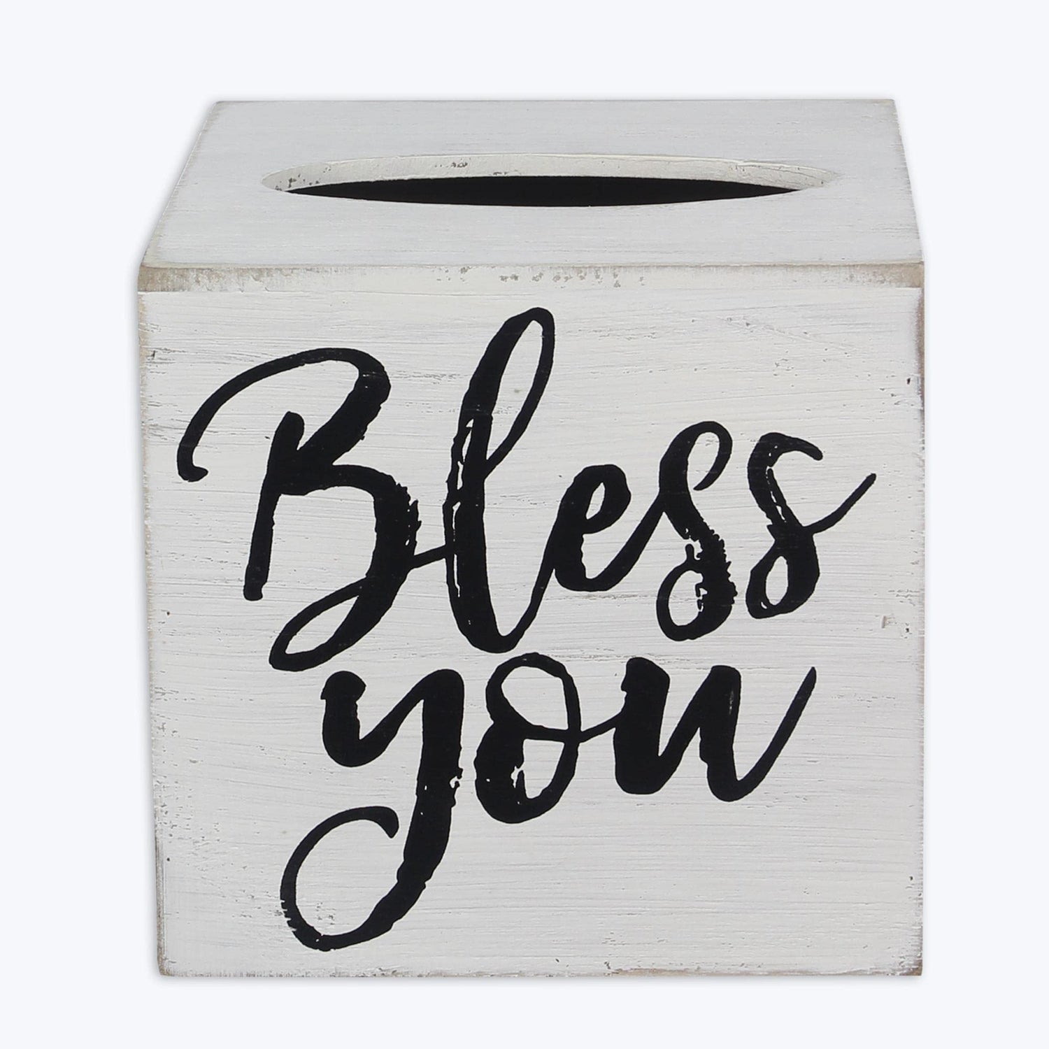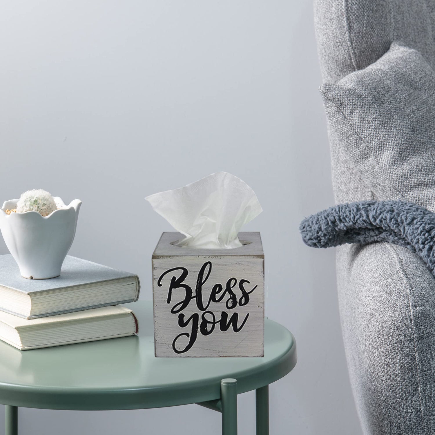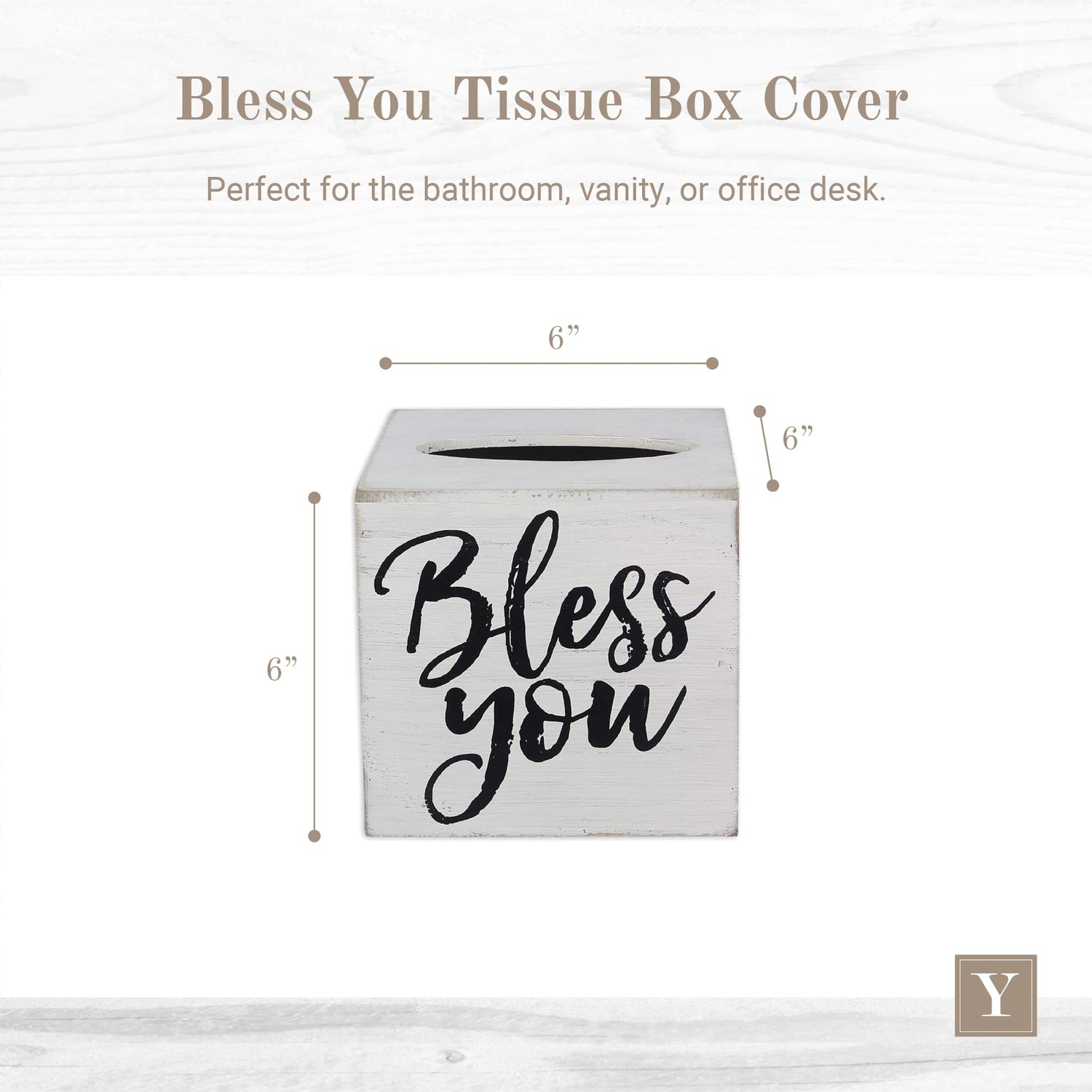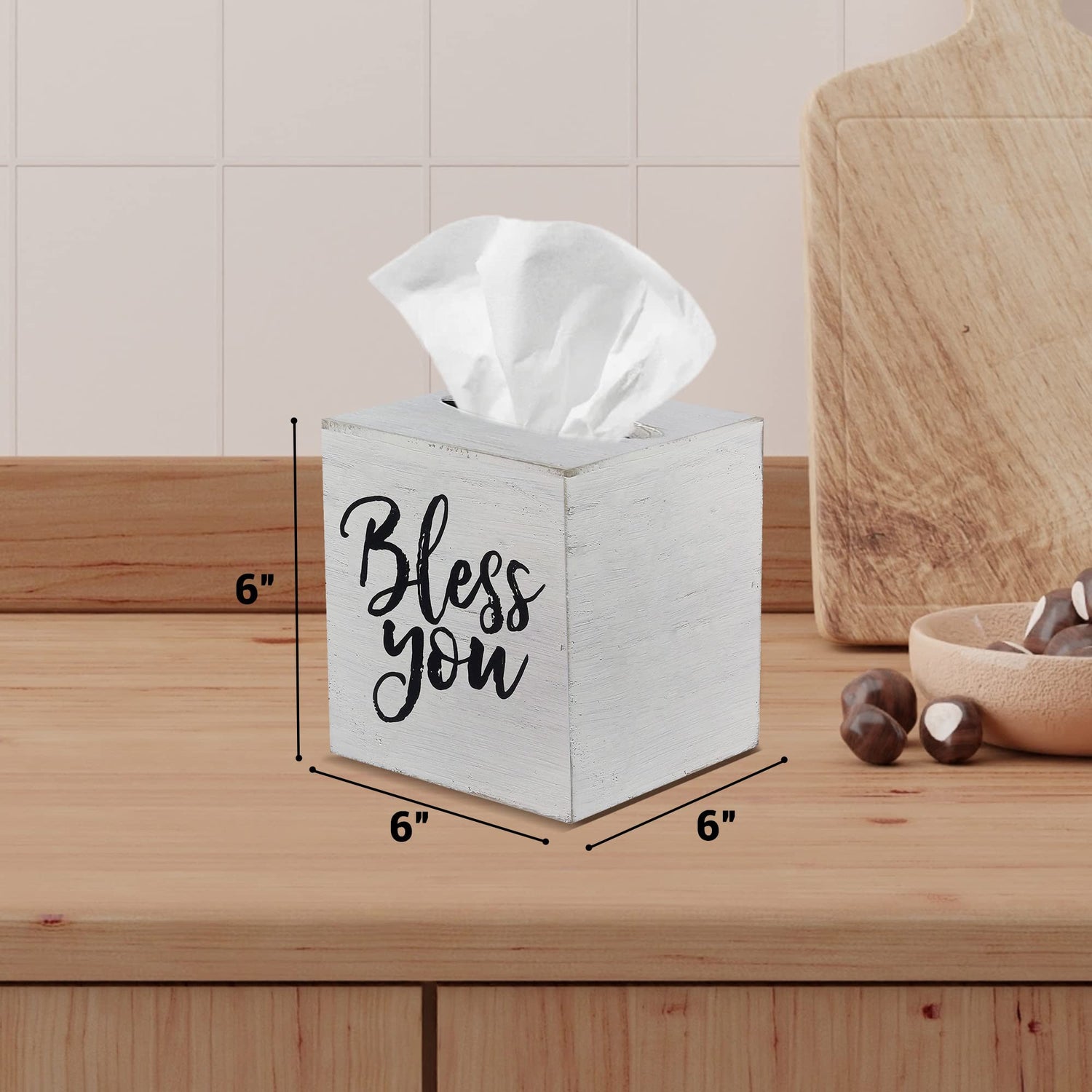 - TISSUE BOX HOLDER: Add a gentle woodsy charm to any space in your home with our farmhouse tissue box cover. This wooden container features a white distressed and weathered background and includes full graphic text in black that reads, 'Bless You.'