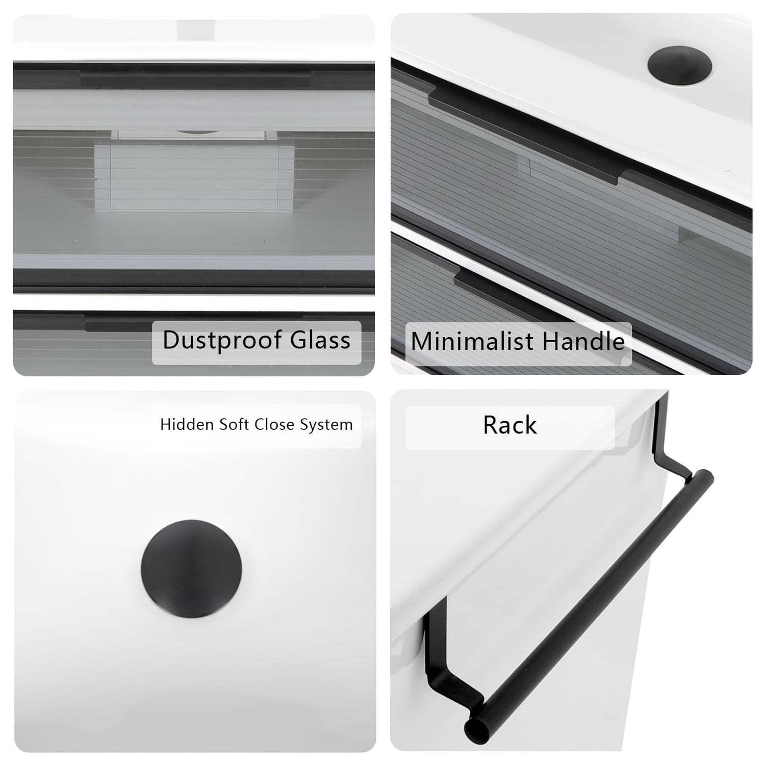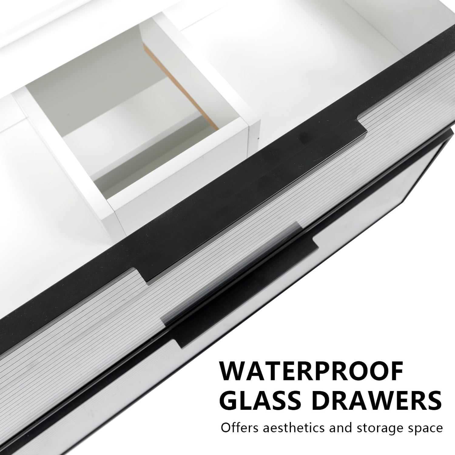 - Floating Vanity with Glass Drawers: The bathroom cabinet is designed with 2 oversized glass drawers for storage needs. Together with the techy white lines and hidden handles, the bathroom will be clean and tidy.