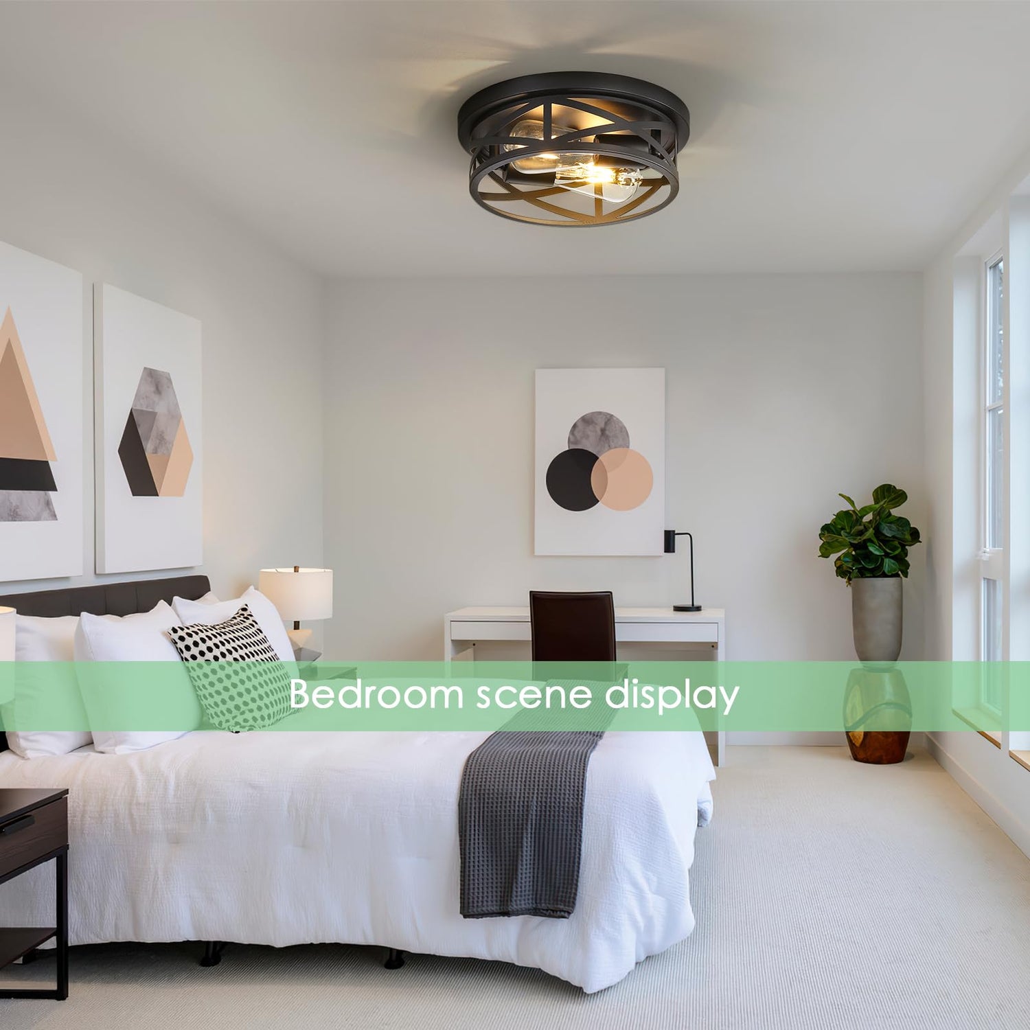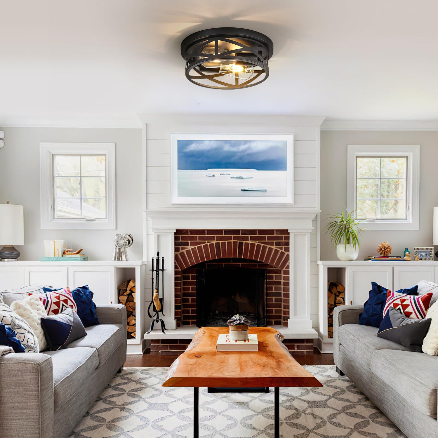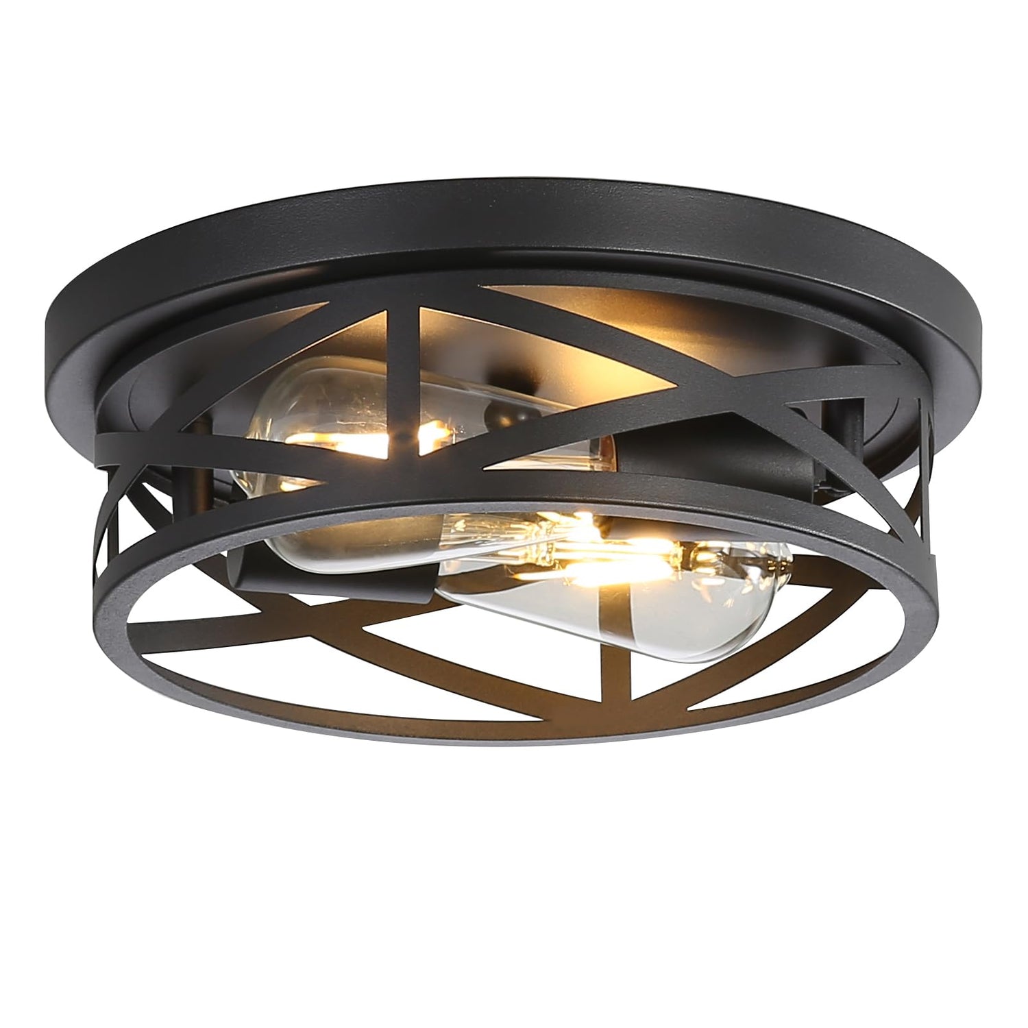 Youroke Farmhouse Flush Mount Ceiling Light Fixtures, Industrial Close to Ceiling Light 2-Lights, 11 Inch Metal Black Cage Rustic Style Ceiling Light Fixtures for Hallway Kitchen Bedroom Entryway