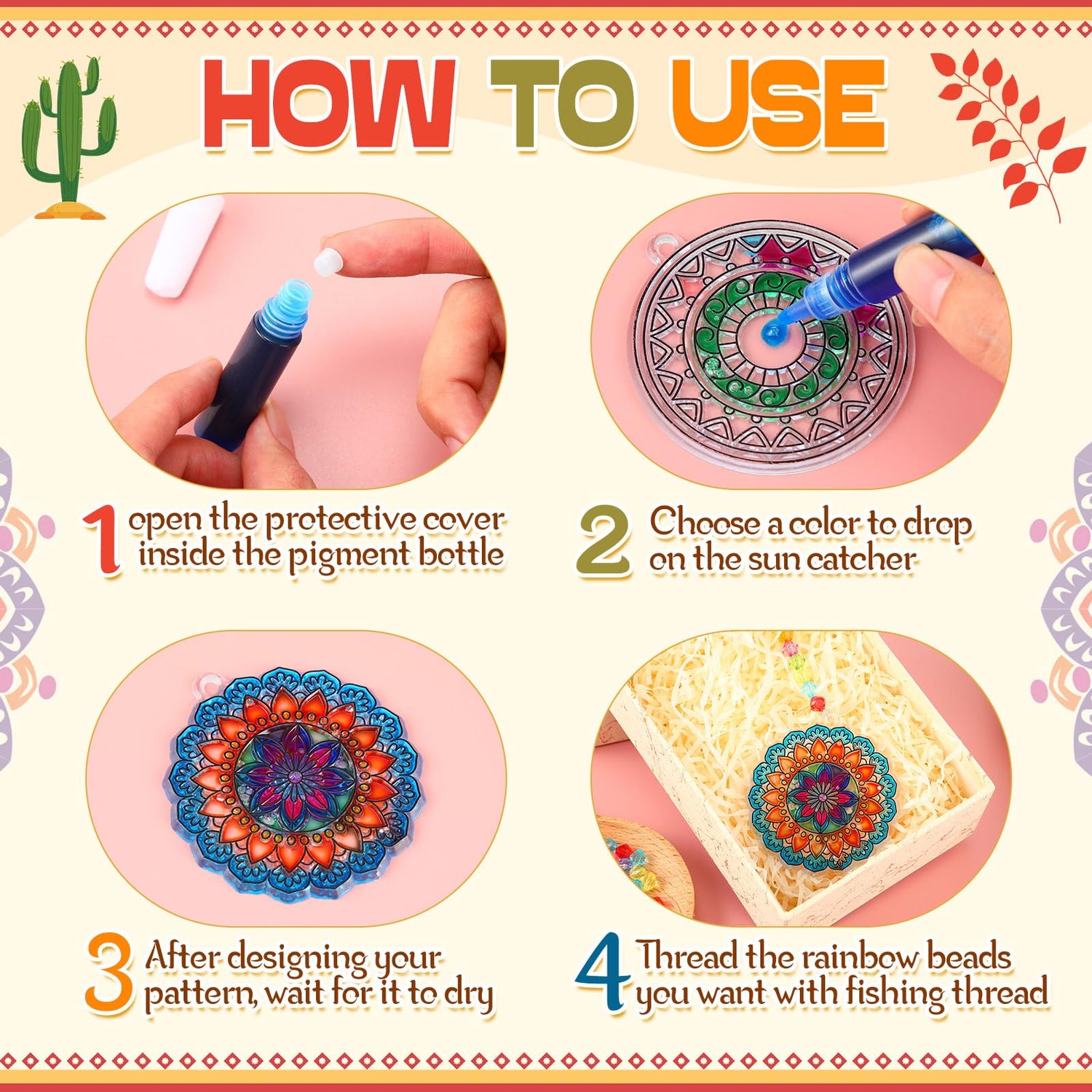 - Special Design: the DIY painting sun catcher is designed with eight classic mandala patterns and matched with 10 different colors of paint; You can use your imagination and fill in the paint to design the mandala sun catcher you want; The transparent design allows sunlight to produce beautiful colors, bringing lifelike mandala flowers to any space