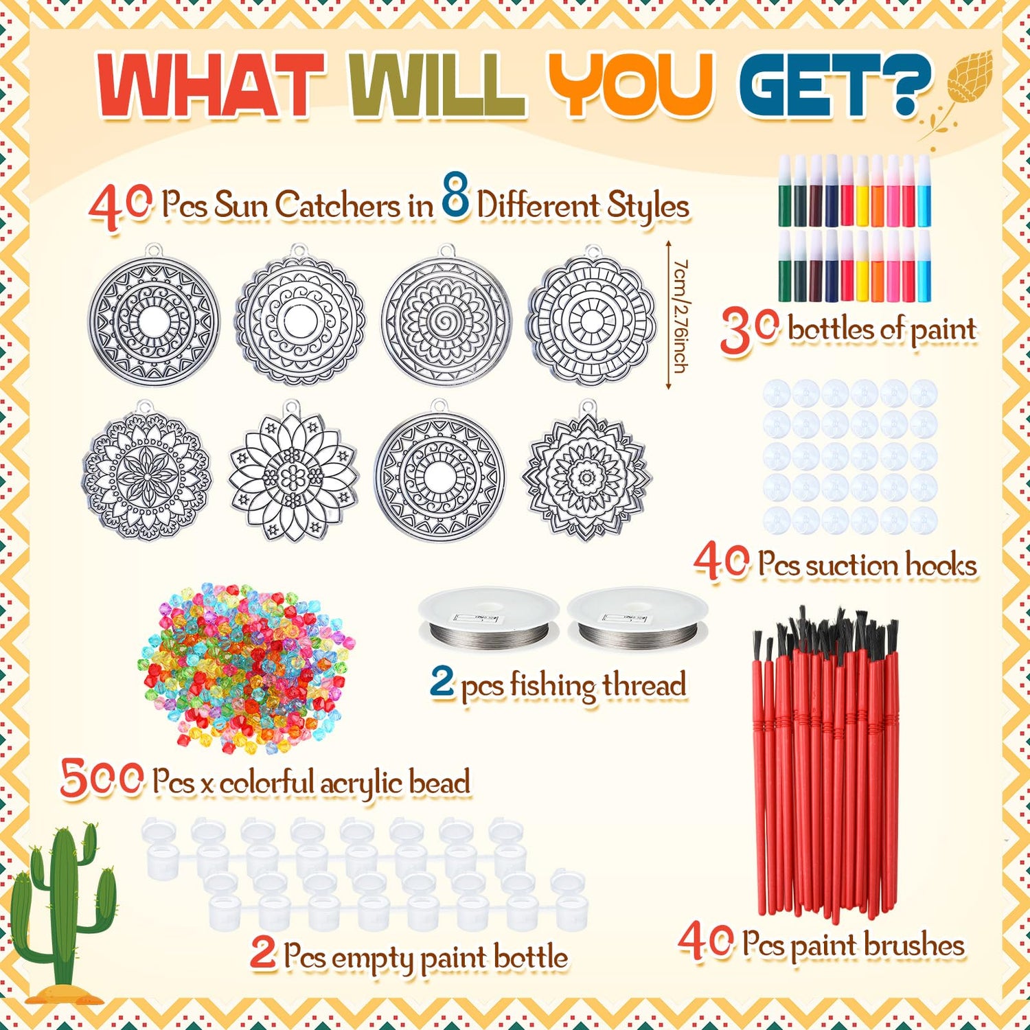 - Suncatcher Kits: 24 mandala suncatcher painting art set, includes 24 mandala flower suncatchers in 8 designs, 20 bottles of suncatcher paints in 10 colors, 30 paint brushes, 30 suction Hooks, 400 rainbow beads, 1 8 empty paint cans, 1 roll of fishing line; There is a hole at the top of each visor for hanging, Suitable for boys and adults