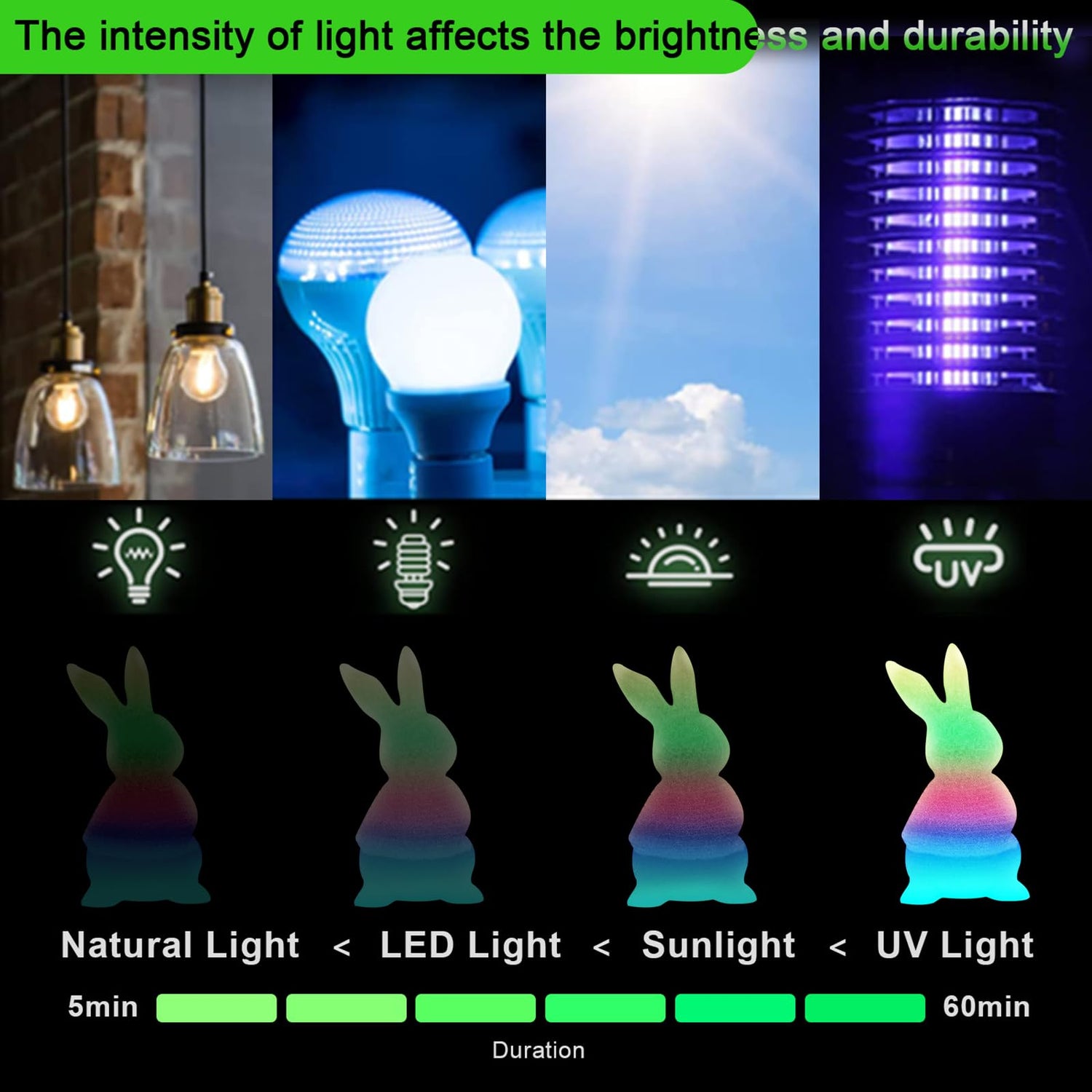 - 【1.75mm Glow PLA Filament 】Glow in Dark PLA Filament Contains phosphorescent materials that glow in the dark after absorbing light energy. The glowing effect will be stronger under Sun light or UV light source after 30 miniutes,Enjoy different printing fun with Yousu 3D Glow in Dark PLA filament.
