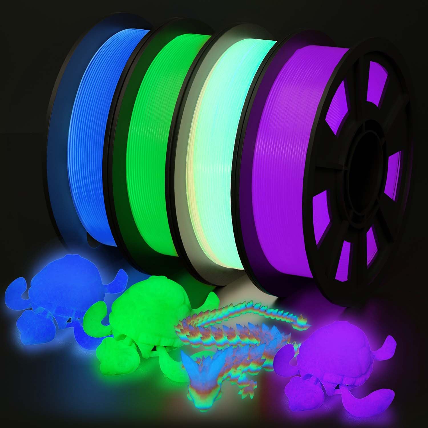 - 【Tangle free & High compatibility】 - 250g*4 Sample Pack 3D Printer filament,No tangle winding filament and compatible with the most FDM 3D printers, feed smoothly and constantly without clogging the nozzle or extruder.The color include Glow in dark green,blue,purple,rainbow.