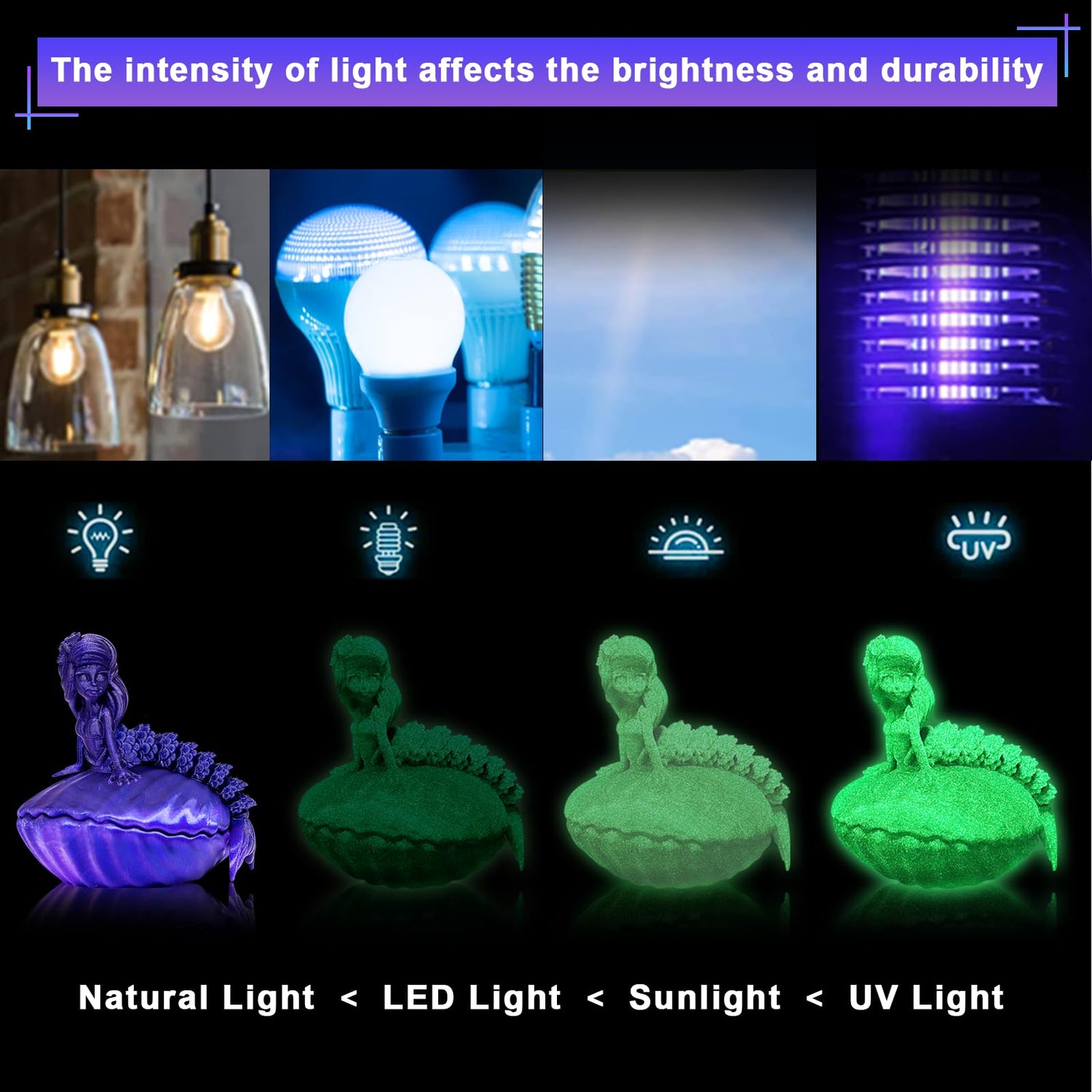 - 【Glow in the Dark PETG filament】This Glow in dark PETG green/blue starry will have different glow result with different light source. Ultraviolet light will make the PETG filament or the printed model has a more bright light; It is suitable for fast printing and printing large-sized models, printed products have flat and smooth surfaces