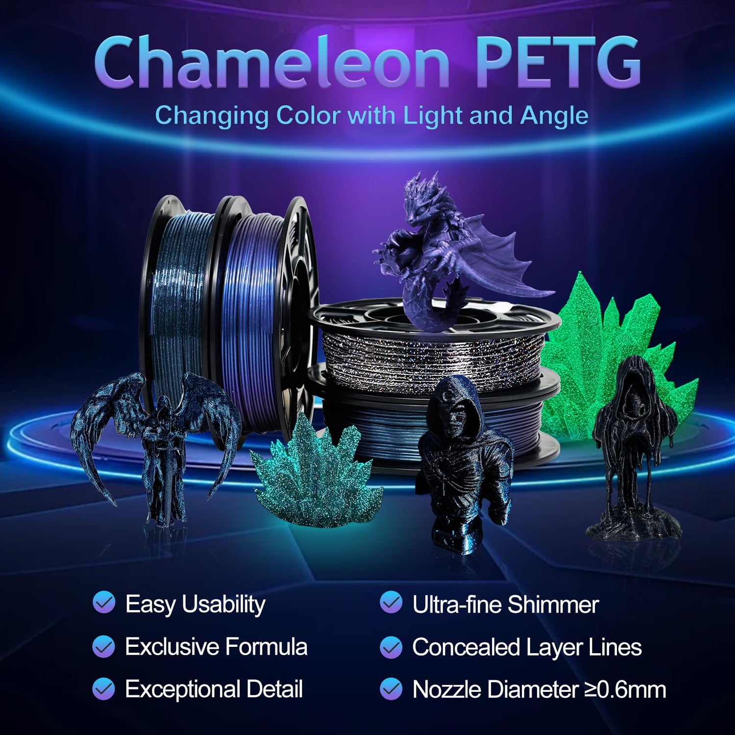 YOUSU 3D Printer Filament Galaxy PETG Filament 1.75mm +/- 0.02mm,Glow in The Dark Laser Chameleon Series 3D Printing Filament Bundle,Multi Color Filament 250g X 4 Color Pack
