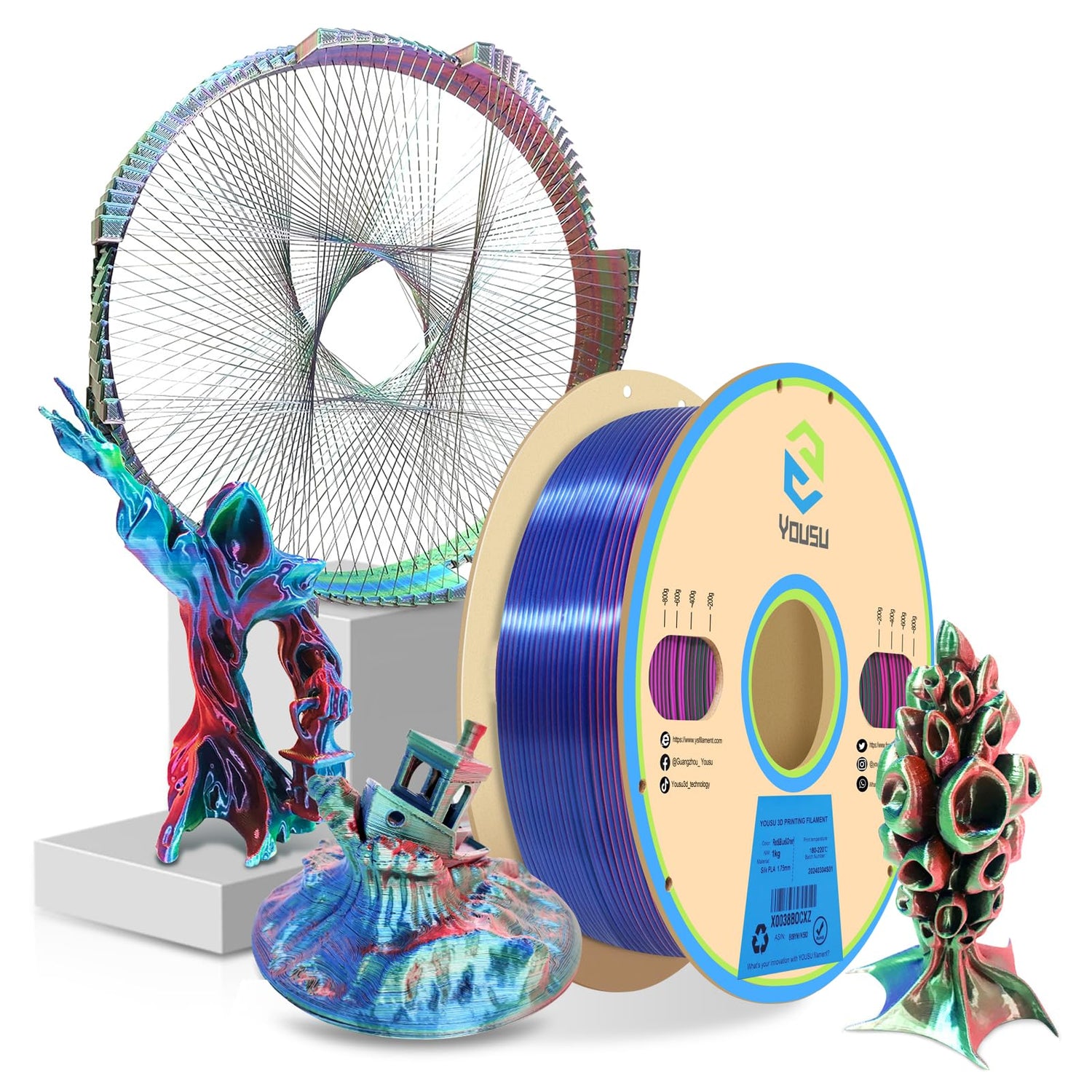 - 【Tri-Colors Coextruded Filament】Yousu PLA filament offers three colors in one, Different from normal color change rainbow PLA filament, every inch of this magic 3d filament is made of three colors-Red, Blue, and Green.you will easily get all colors, even for very small prints. Different prints will present different effects. Enjoy your 3d printing creations.