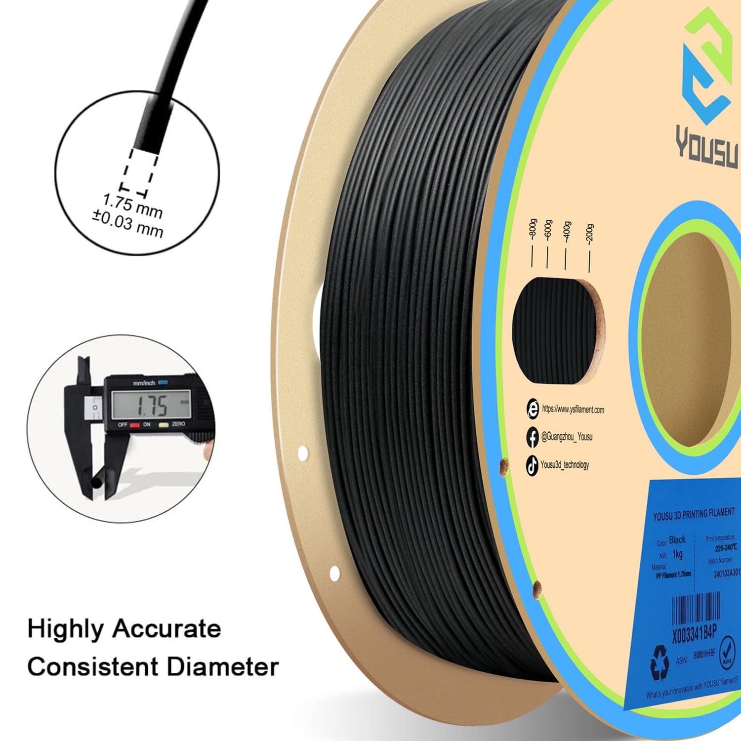 YOUSU Polypropylene PP Filament, 1.75mm 3D Printer Filament for 3D Printing, 1kg(2.2lbs) 5pcs Build Sheet Included, Semi-Flexible Ultra Tough Filament, Black