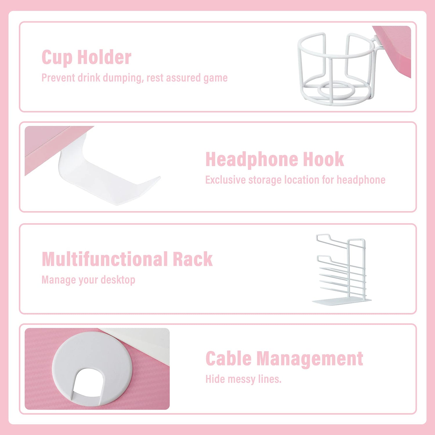- Multifunctional E-sports Table for Gamer- The desk is equipped with game handle rack on the desktop, headphone hook and cup holder at side, which is easy to reach for drinking and listening. Cord collector under the desk make it super convenient to collect various wires and cords to make your space more commodious, no tangled mess under the desk any more.