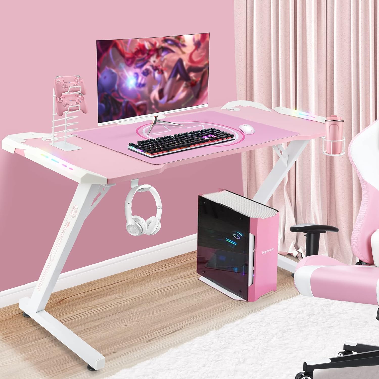 YOUTHUP Pink Gaming Desk with LED Lights, 55" Z Shaped RGB Gaming Computer Table, Ergonomic PC Workstation with Remote Control, Cup Holder, Handle Rack, Headphone Hook, Mouse Pad for Home Office Use