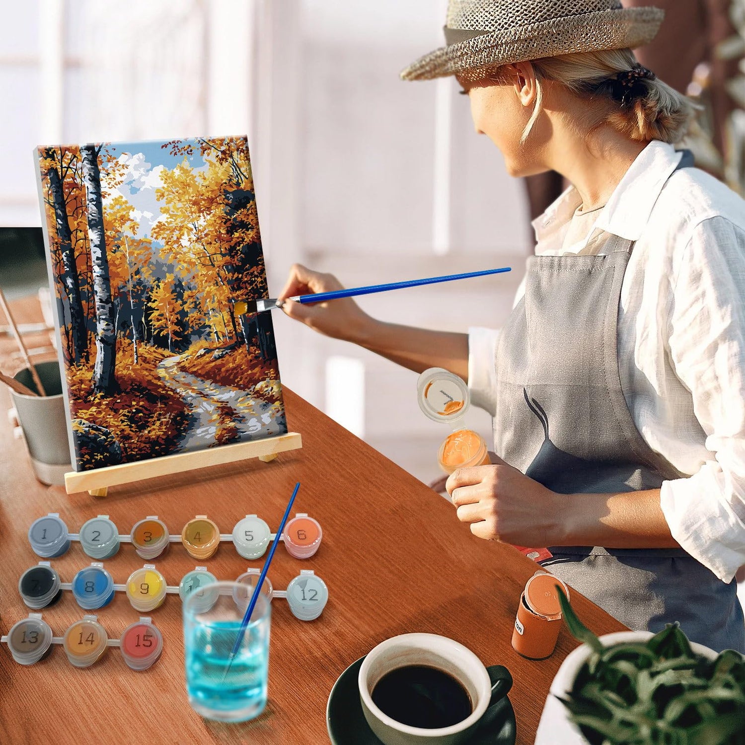 YOYA Framed Paint by Numbers Kit for Adults - Fall Forest Adult Paint by Number Kits on Canvas with Easel, DIY Autumn Landscape Paint by Number Framed Canvas for Home Wall Decor 8x12 Inch