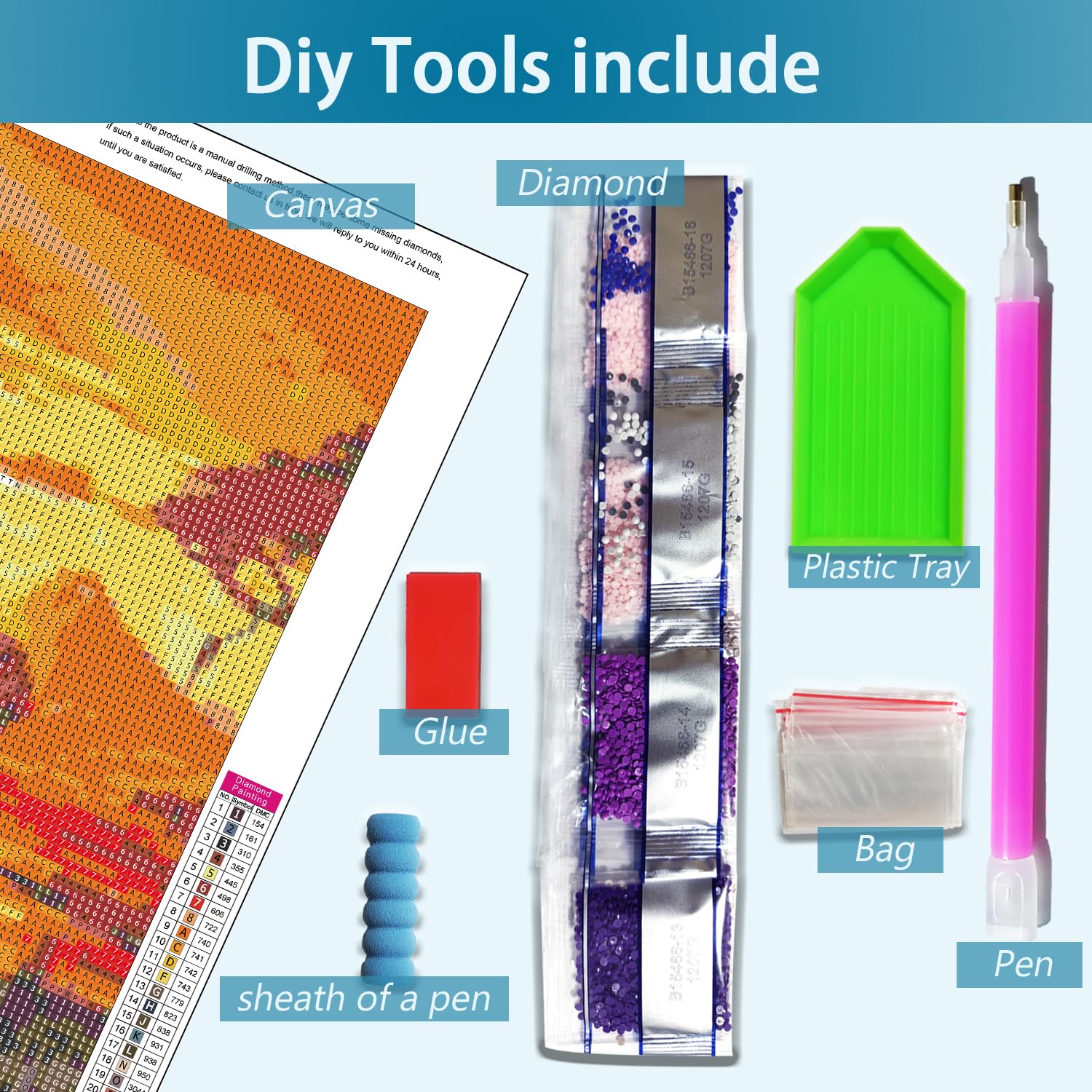 - 【Diamond Art Kits for Adults】Elephant 5d diamond painting kit contains all the tools needed.Includes: 1*HD painting canvas(13.78X13.78 inches),1*diamond pen,1*tray for holding diamonds,1*red glue clay (2cm*4cm),1*pen grip,10*plastic bags for putting diamonds,and enough colorful round diamonds.For each diamond art kit we'll provide 30% more diamond beads than needed.so you don’t need to purchase any additional tools.(This sunset landscape gem painting kit for adults not include frame).