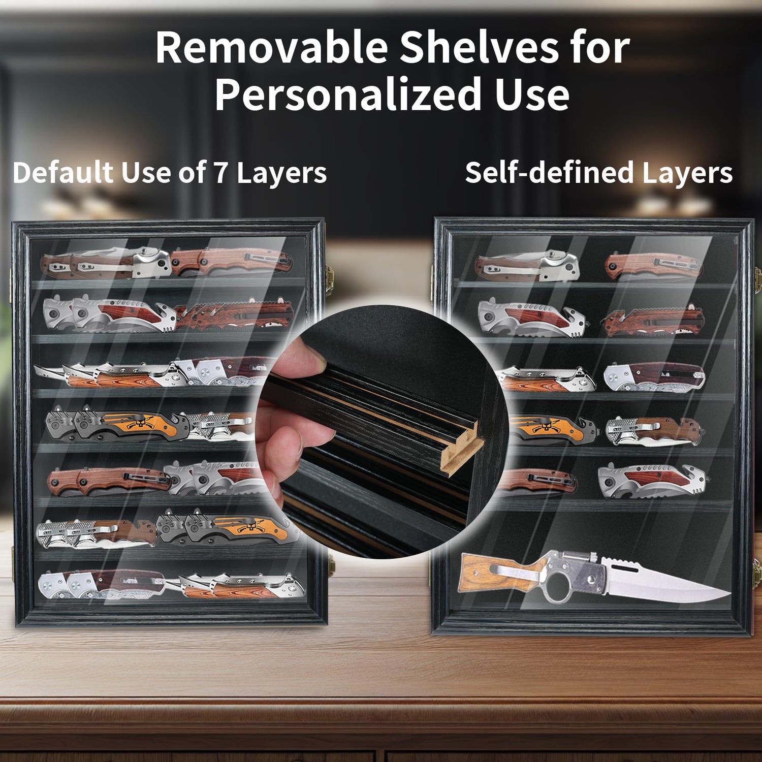 - Removable Shelves - The pocket knife display case features 7 layers, allowing you to store multiple knives. Its removable shelves design accommodates pocket knives of various sizes and designs. The external dimensions of the pocket knife case are 13’‘L x 1.97’‘W x 17’‘H, with a compartment height of 1.88’’ and an inner depth of 1.22’'. This exquisite knife collection case can also serve as a shadow box for storing other small items, such as medals, badges, and photos
