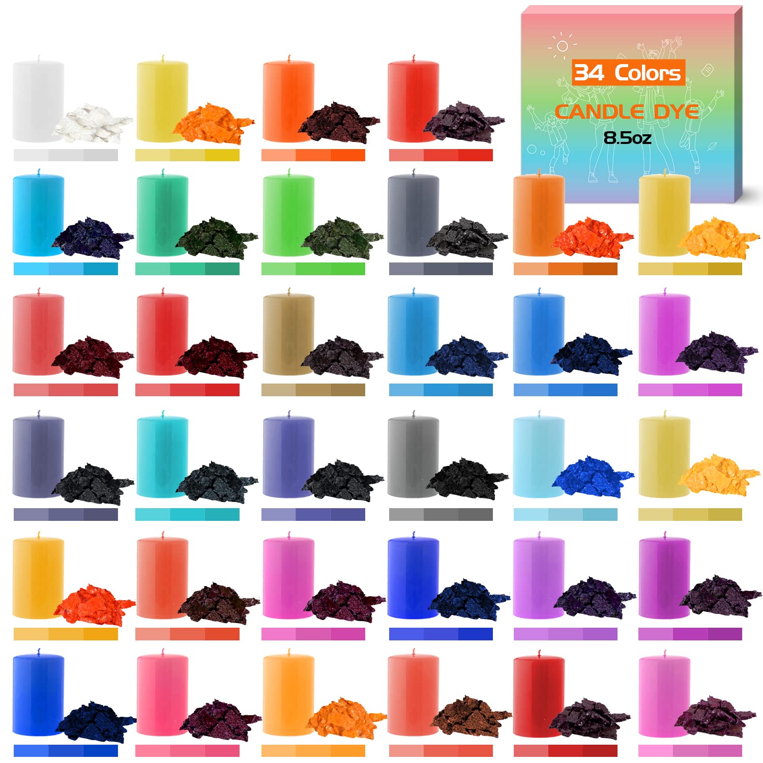 - Candle Color Dye for Soy Wax: The soy wax dye set contains 34 vivid colors of candle wax dye for candle making. Our candle dye has good dyeing effect and high color rendering. The 8.5oz candle dye will be enough to dye 188.8lb of wax. This candle color dye is a gift ideal for your friend who love candle making, which are great for paraffin, beeswax, soy wax, gel wax and more
