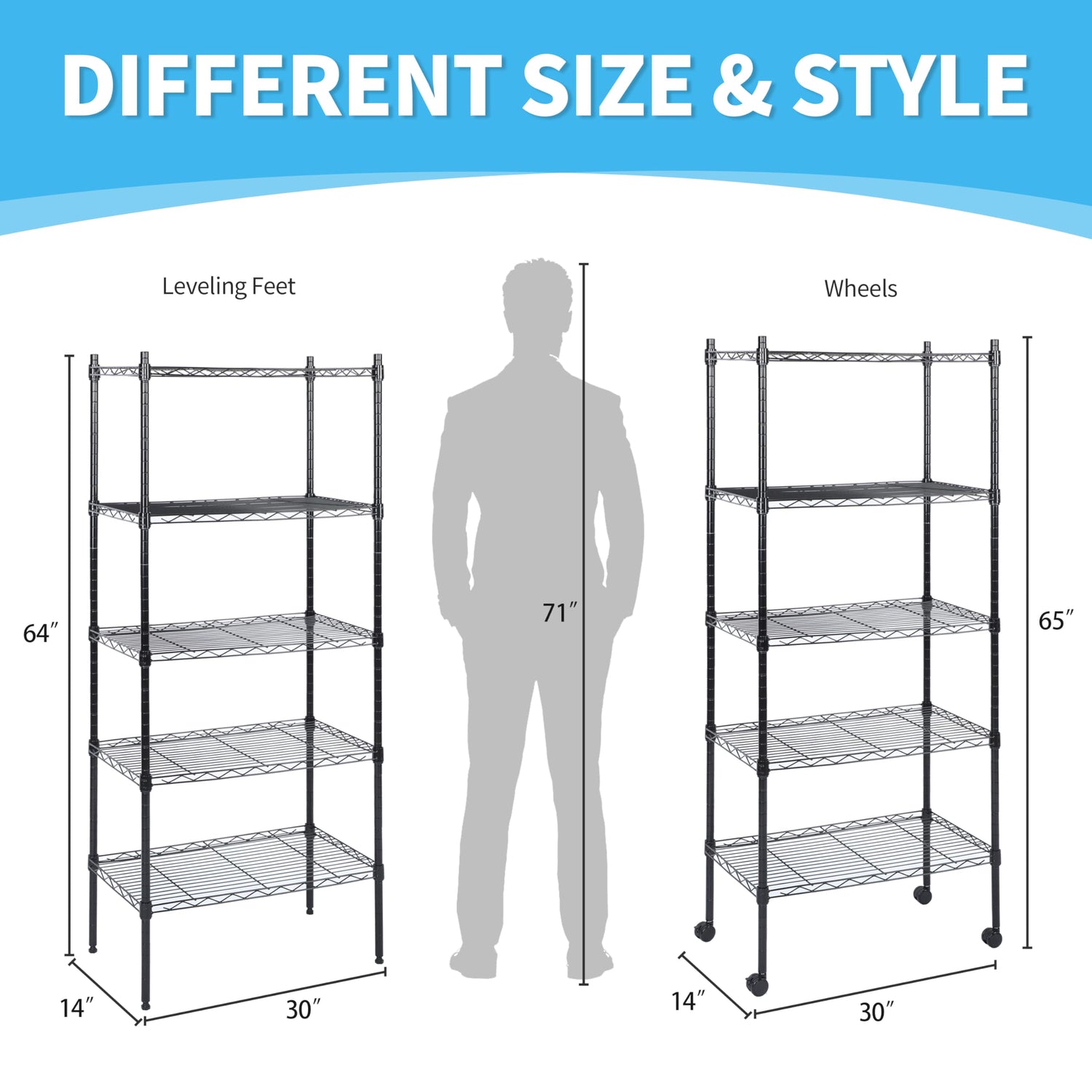 Details: Maximize your storage efficiency with the HealSmart 5-Tier Black Wire Shelving Unit. Constructed from industrial-strength steel, this system features a sleek black finish that provides excellent corrosion resistance, ensuring long-lasting durability and a polished, modern look.