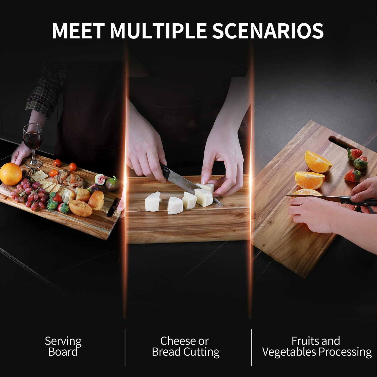 - đ´ ăStylish and Versatileă: The smooth polished edges showcase the natural beauty of acacia wood, making it more than just a cutting board. It can also double as a platter for serving cheese, meats, vegetables, bread, and other appetizers. It's a perfect choice for chopping, slicing, or displaying at festive gatherings and an ideal companion for summer barbecues or outdoor events.