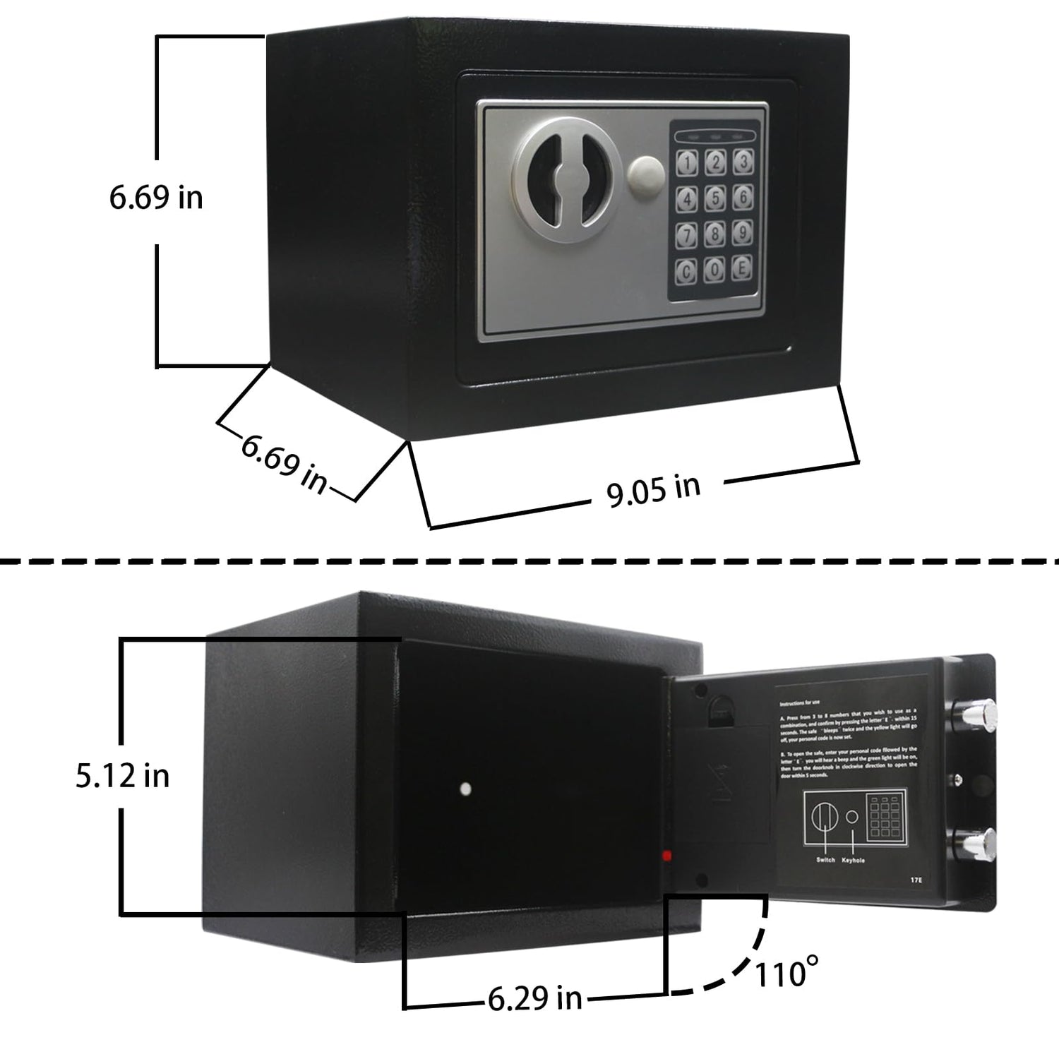 - SMART CAPACITY:0.2-cubic-feet, Exterior :9.1" x 6.7"x 6.7", Interior size: :6.5" x 8.9" x 4.3" (Pls pay full attention to the dimension for this MINI safe box),It gives you easy personal access to your valuables .