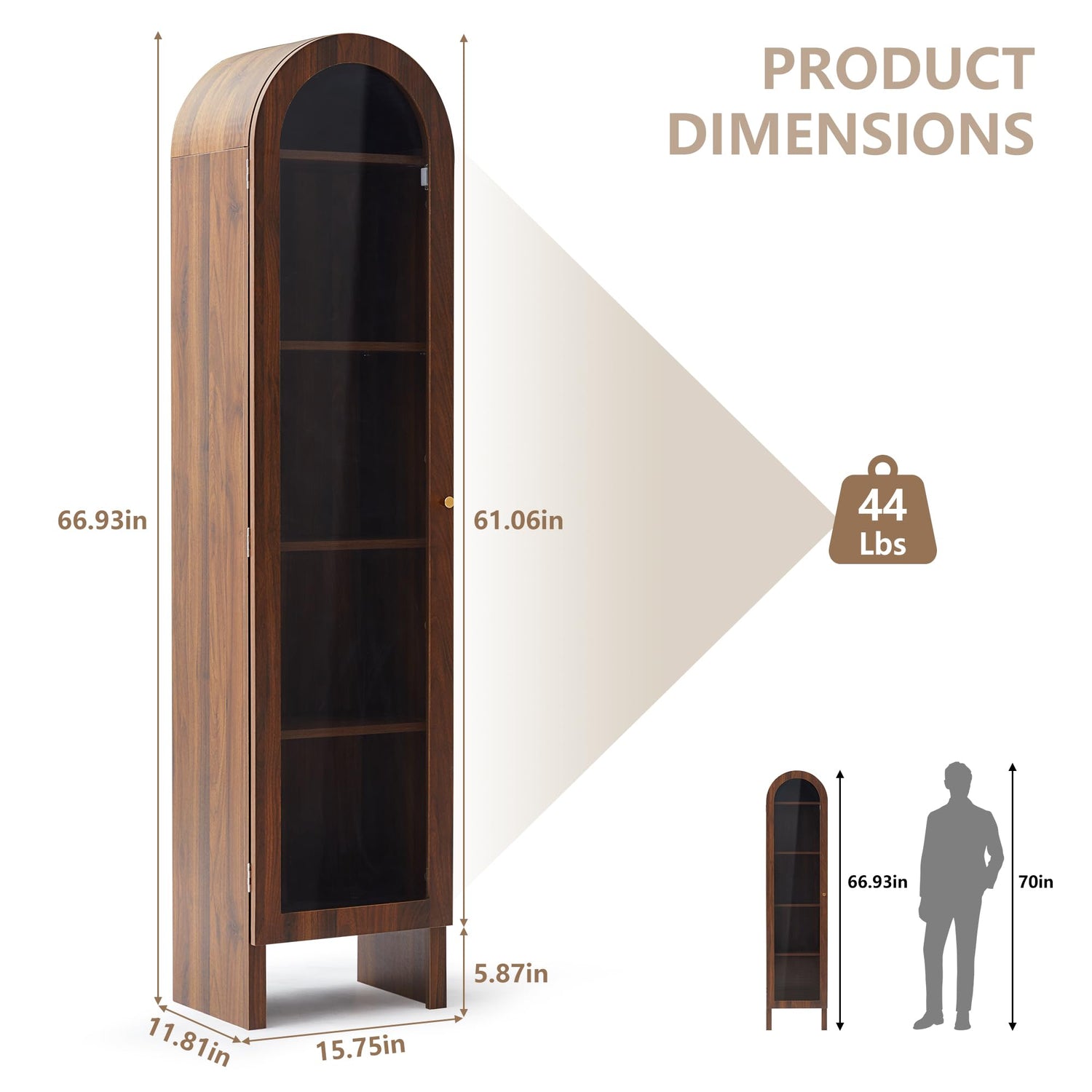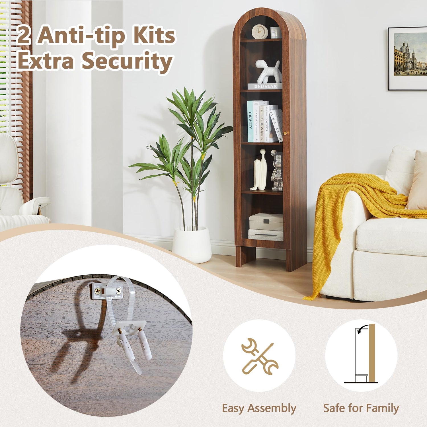 - 【 Product Advantage 】This arch cabinet has 5-Tier shelves and is equipped with organic glass doors, allowing for more flexible display and storage of your items. Solid wooden legs and anti tipping device design for greater safety and reliability. This freestanding cabinet can be used as a file cabinet in the office; or as a display shelf in the living room or next to the TV; or as an ornaments shelf in the bedroom/cloakroom etc.