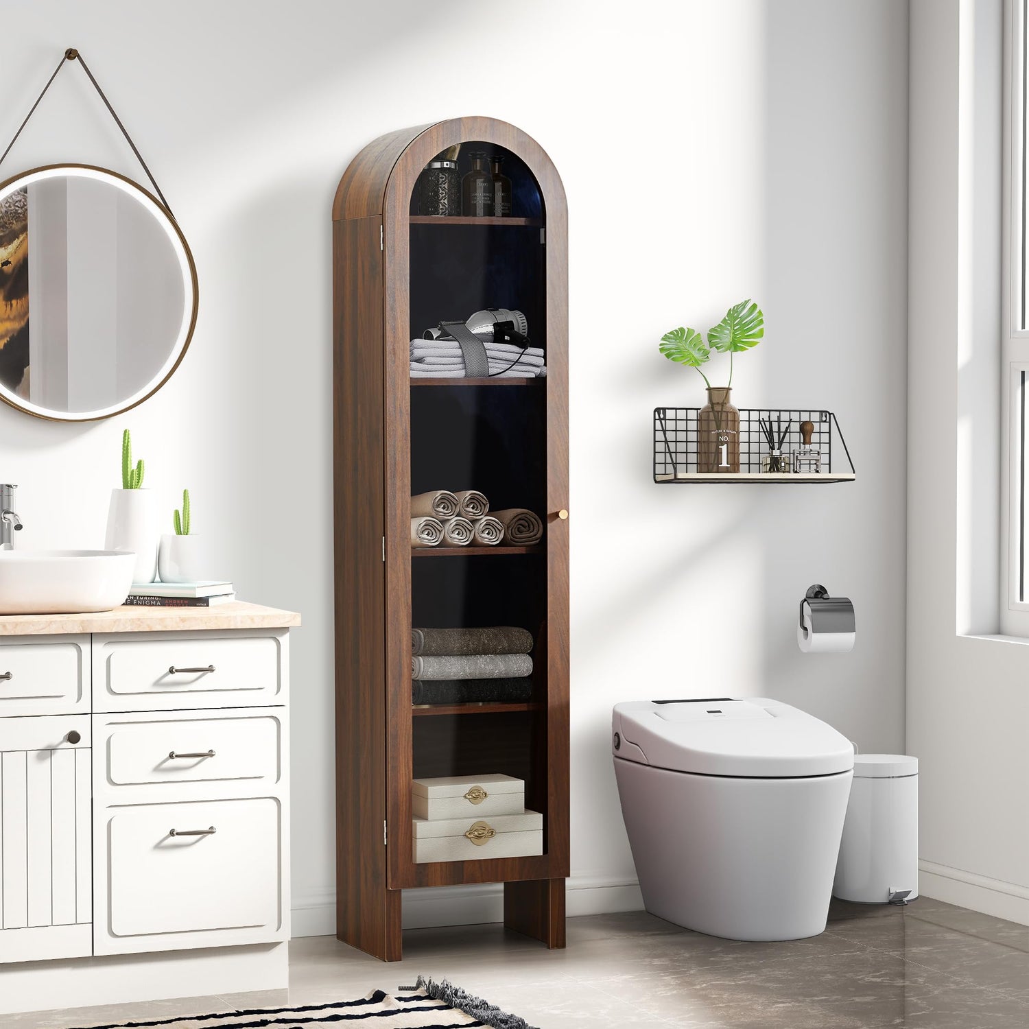 YUCHIATH 66.93" H Arched Bookcase, 5-Tier Arched Cabinet Bookcase with Adjustable Shelves, Accent Display Cabinet with Glass Door for Living Room, Reading Room and Bedroom (Walnut)