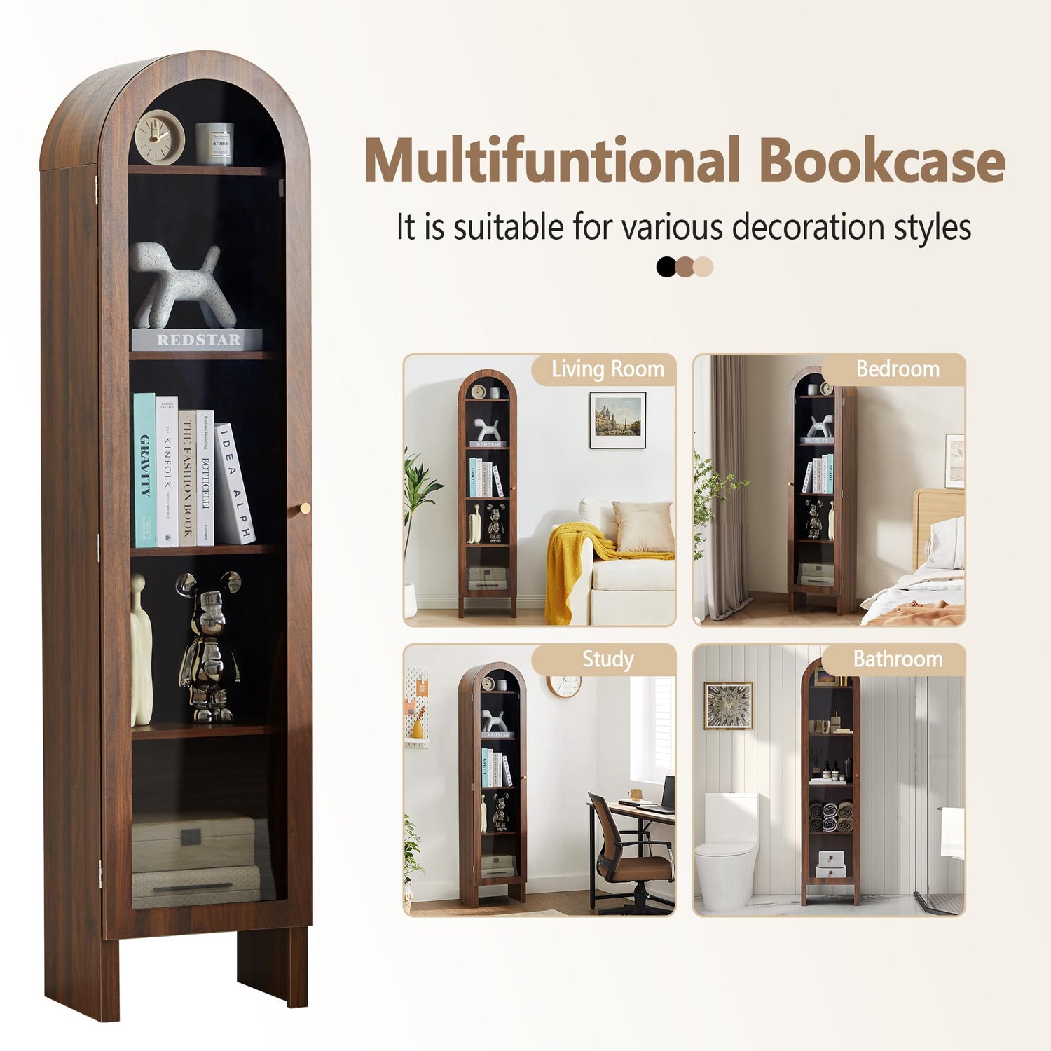 - 【 Style and Appearance 】Modern arched design of the display bookcase not only has a strong fashionable classic style, but also appears grand and beautiful. No matter where it is placed, it can perfectly integrate different styles of home decoration, and add modern and classic elements to your decoration style, making your home easy to have a different sense of beauty and warmth