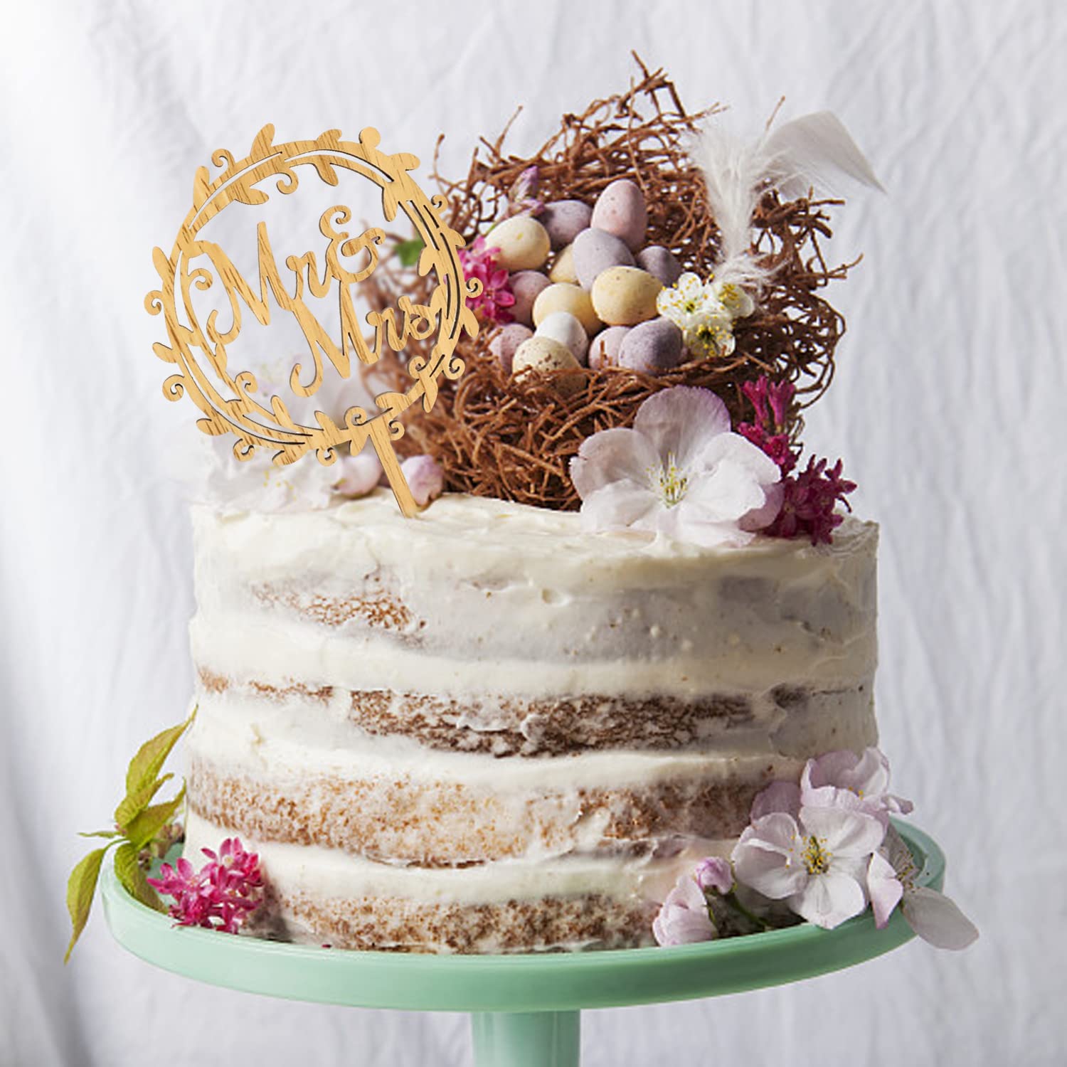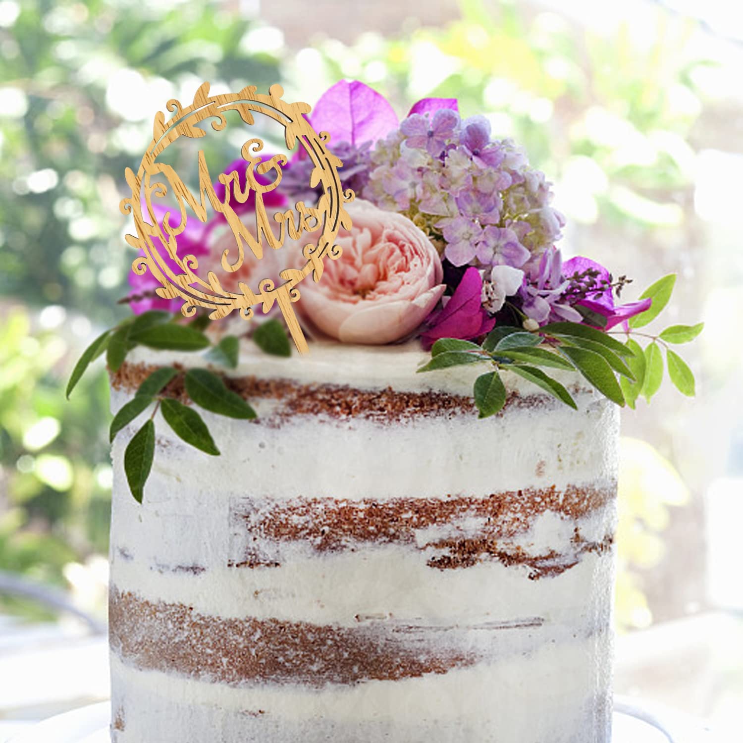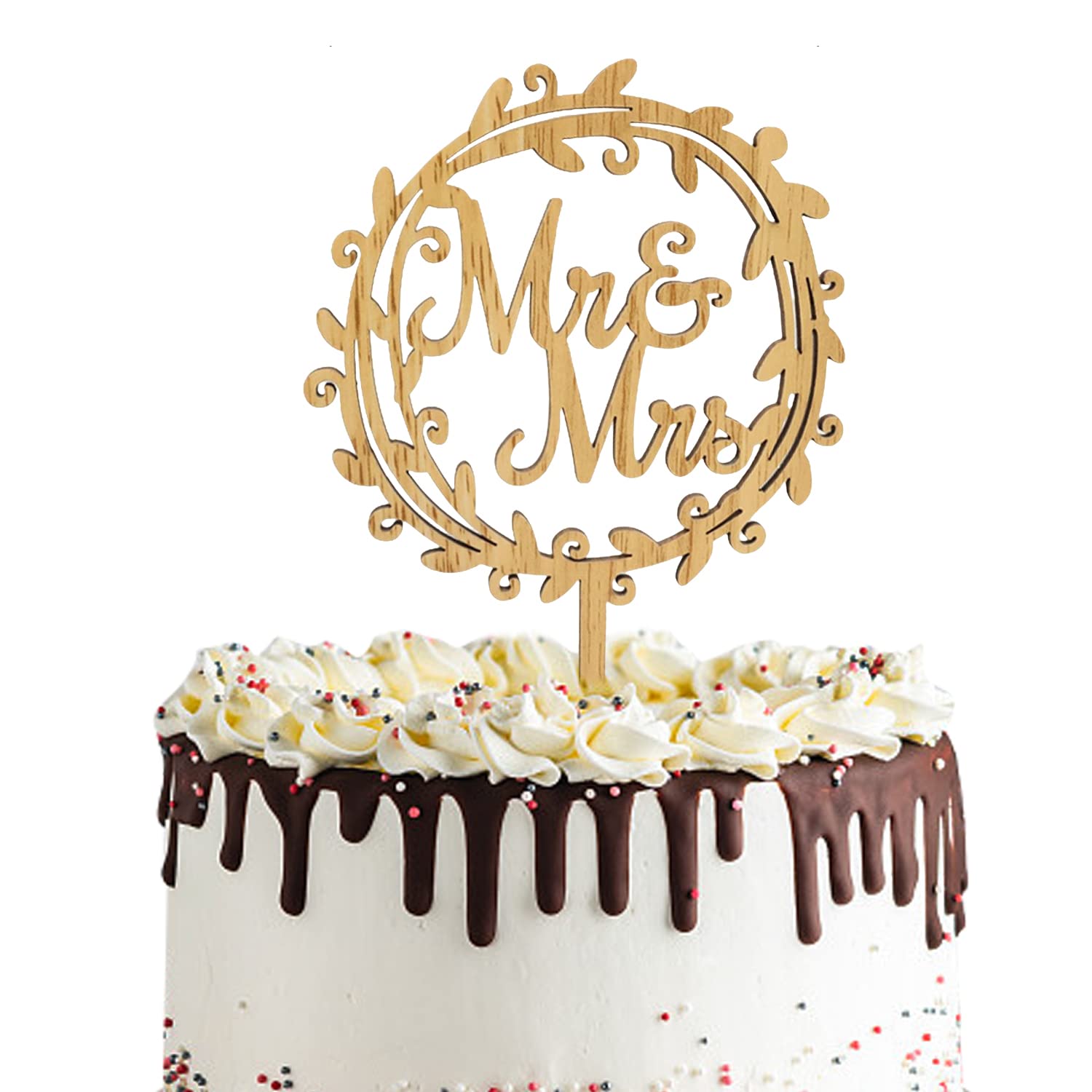yueton Mr & Mrs Wooden Cake Topper, Chic Rustic Style Wedding Engagement Cake Topper, Mr and Mrs Wreath Cake Decoration, Wedding Anniversary Party Supplies - with a Gift Box