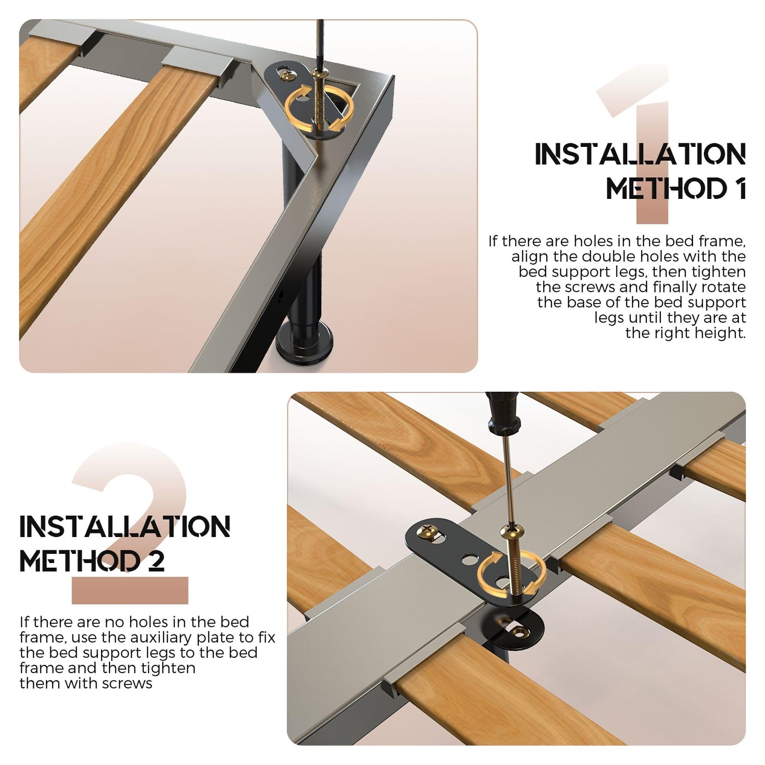 - 【You Will Get】 4pcs support legs of bed frame, 8pcs set screws, 8pcs auxiliary plates. Please make sure to measure the width of the support beam in the centre of the bed and the height you need in order to purchase the right size (adjustable height of current selection: 7"-12.6", Make sure your bed frame height does not exceed 12.6" before purchasing.)