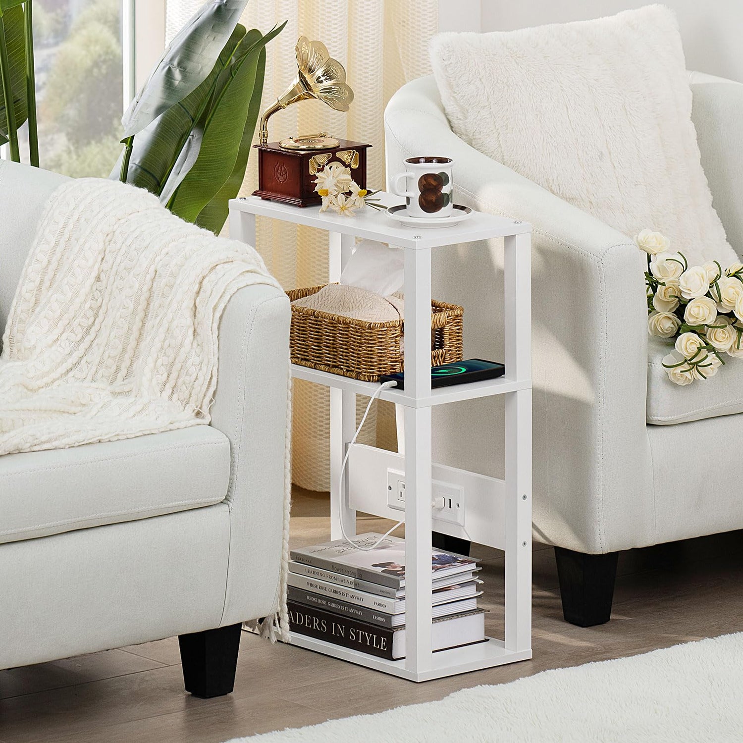 - Space-saving 3 Tier Storage: 15.75"D x 7.87"W x 23.62"H, this skinny side table with charging station is perfect for small spaces as a sofa end table, night stand and bed side Table placed in corners and small spaces, the side table is not very spacious but still has enough room to add a table lamp on the top panel, photo frames, coffee and magazines where you can enjoy a short relaxation with a cup of coffee or tea, and a middle and lower tier to help you organize more essentials.