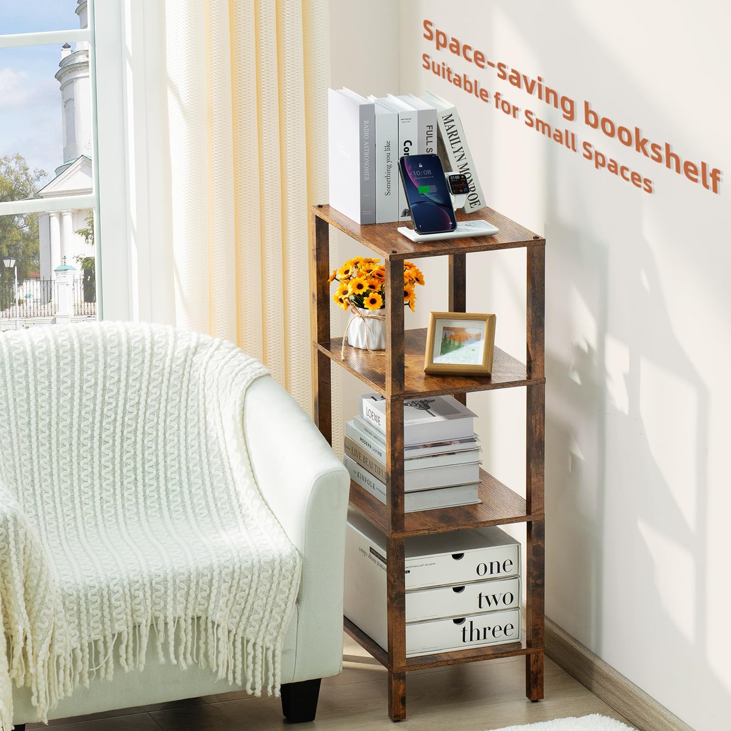YUFAM 4 Tier Tall Wooden Bookshelf with Storage - Small Bookcase for Small Spaces, Small Shelf for Living Room, Office, Bedroom, Kitchen - Industrial Retro Brown Book Shelf