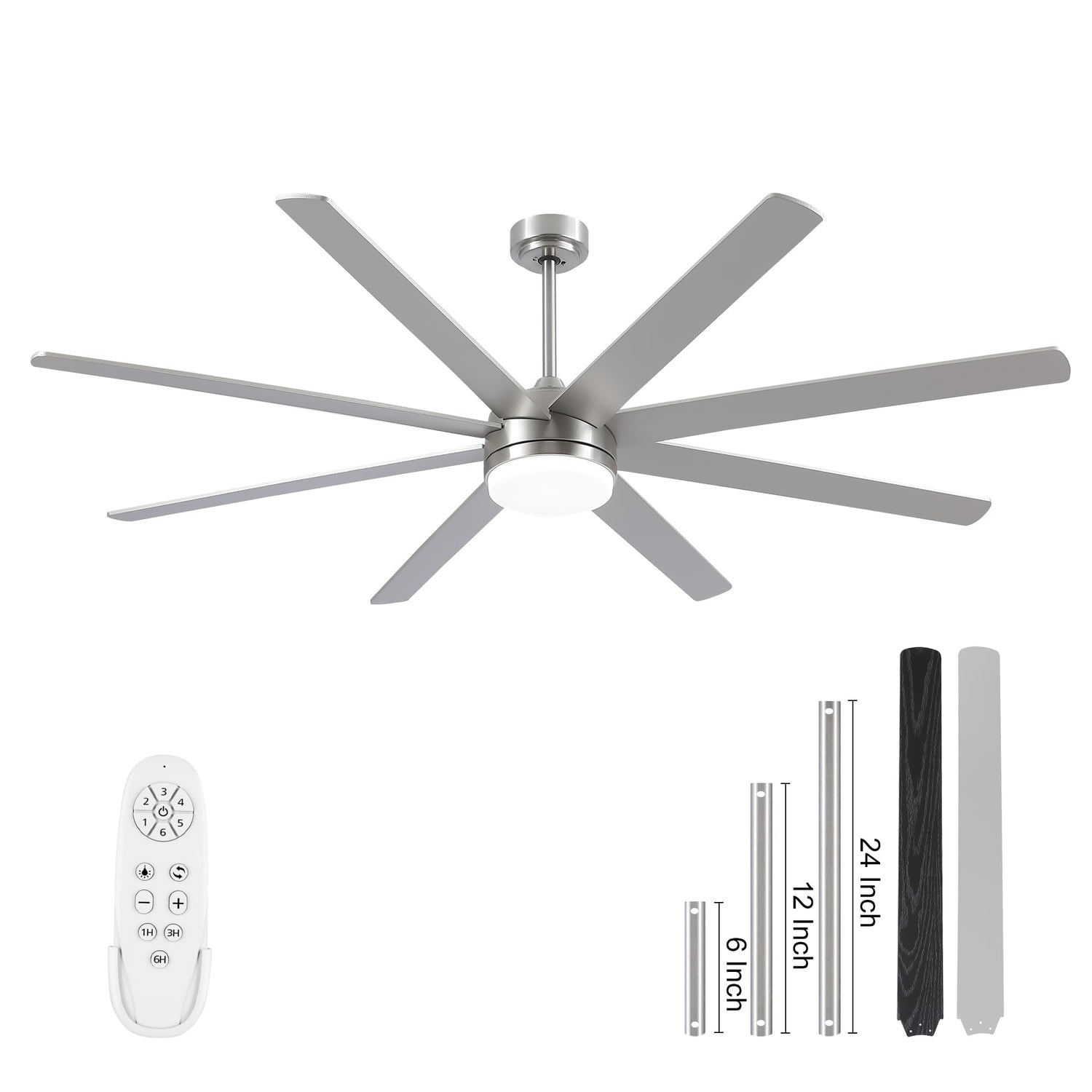 - Brushed Nickel Ceiling Fan: The ceiling fan uses a DC motor, which is more energy efficient than AC motors, and with the use of LED lights, you can maximize your energy cost savings (Class A energy consumption). The motor is made of thickened silicon steel sheet, pure copper wire and two silent bearings, durable and noiseless. The five double-sided wooden blades can be mounted in the direction of your choice, allowing the ceiling fan to fit perfectly with your home's style.Includes (6“, 12” and 24" rods) for multiple ceiling heights.