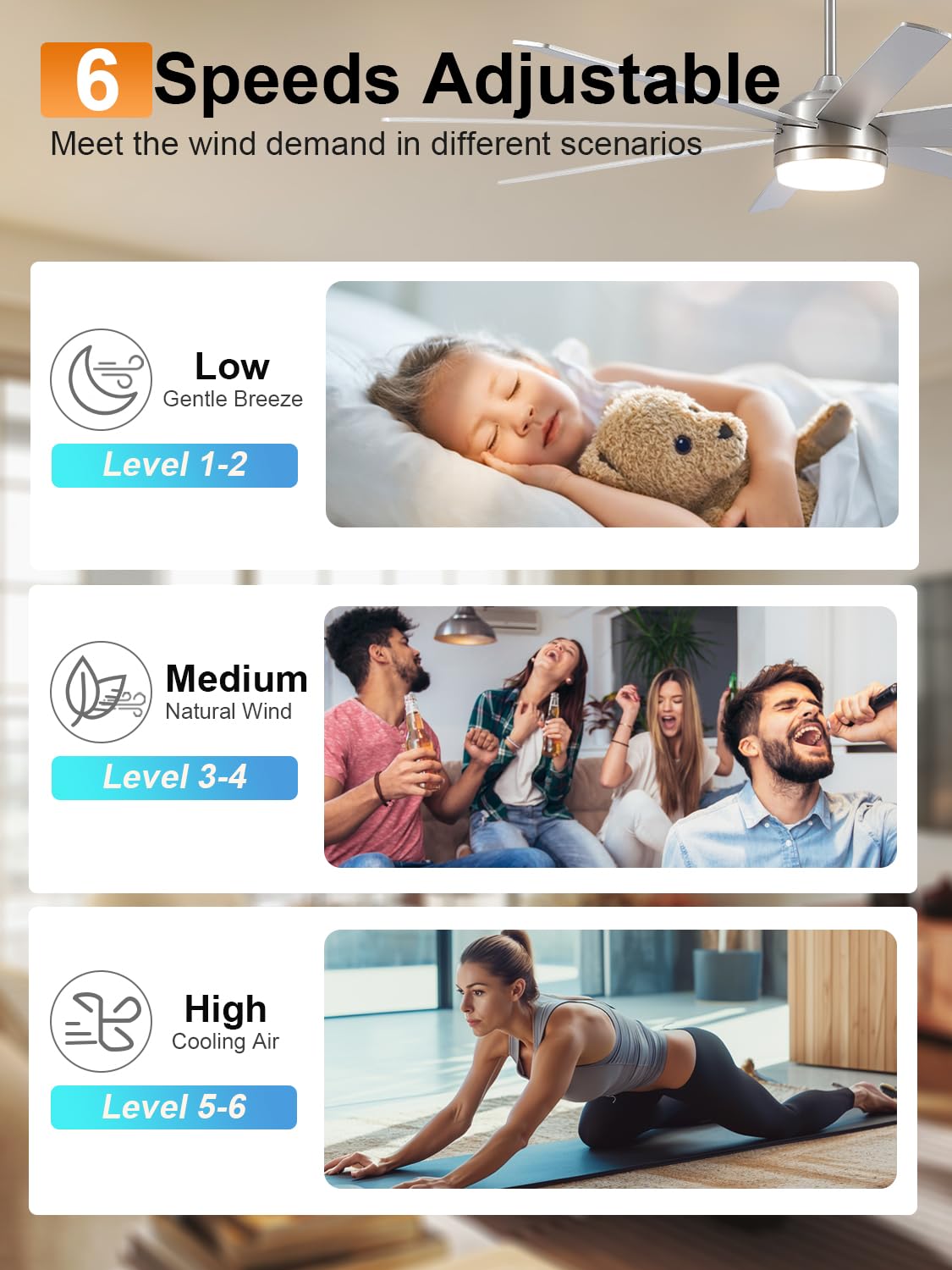 - 6 Speed Reversible Motor:Summer mode circulates air downward and the ceiling fan delivers more than 6700 CFM of airflow to keep you cool, with less than 25 decibels of sound, for a comfortable sleeping environment. Winter mode circulates air upward, evenly distributing warm air generated by the indoor heating unit throughout the room. Choose from six speeds to meet your many airflow needs. Can be used year-round