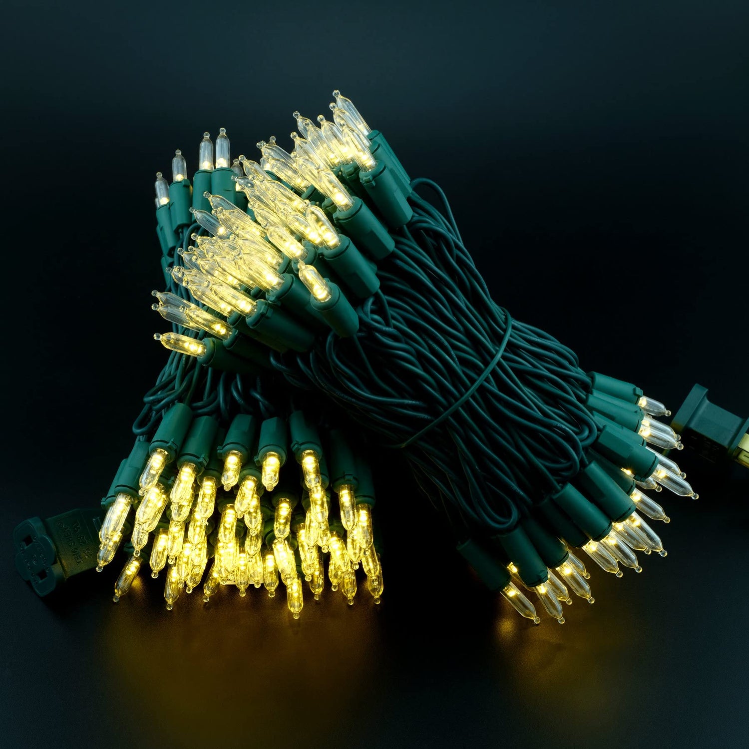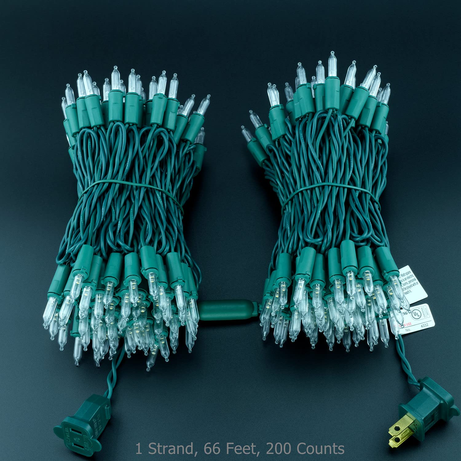 - Extra Long More Lights. 200 warm white LED bulbs on green wire, 1 strand total length 66 feet. 4-inch spacing, 6-inch lead, 6-inch tail. With a tangle-free design and robust commercial grade 22 AWG wire with a pure copper core, installation is swift and professional. Waterproof design allows it to be used indoors and outdoors. The versatility of our malleable string lights is limitless: adorn Christmas trees, railings, stairs, fences, bushes, or shape them creatively to match your décor.