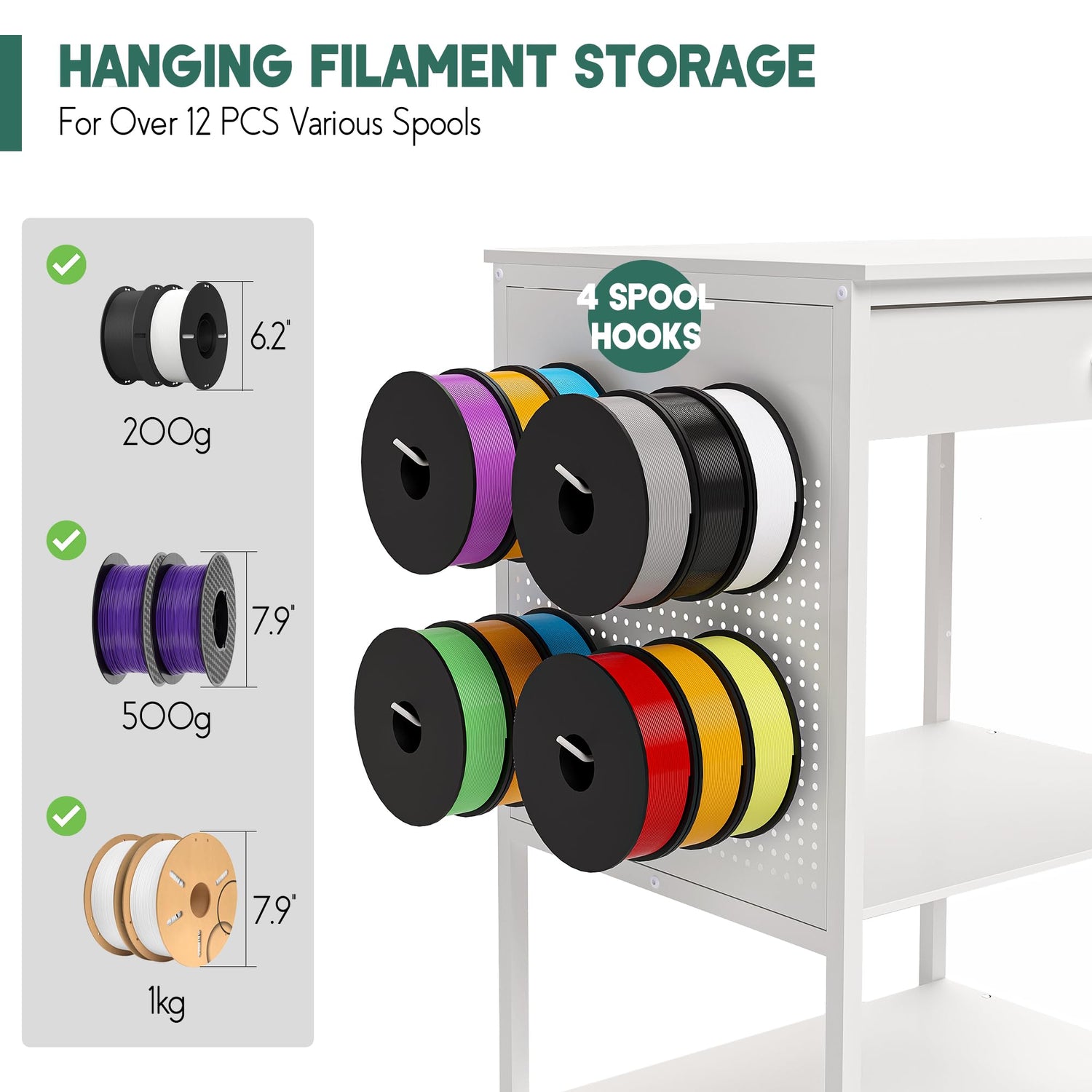 - 【Pegboard Filament Holder】Stay organized with the side pegboard, which features four spool hooks that hold up to 12 filament spools of any size, from 200g to 1kg. The flexible hanging design allows for direct access to your 3D printer supplies, while extra pegboard space enables you to DIY and customize your storage solutions freely