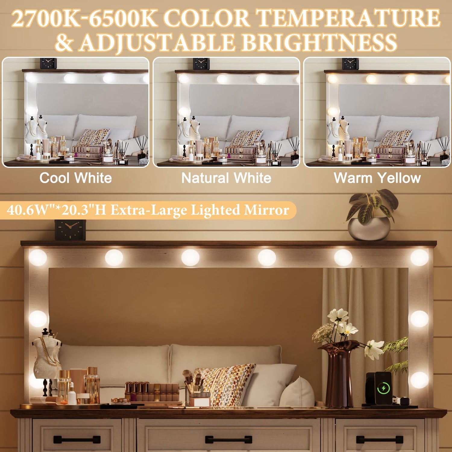 - Large Mirror: The 40.6”L x 20.3”W oversized mirror of the vanity dresser is framed with 10 hollywood lights in 3 colors and brightness, offering perfect illumination for flawless makeup application