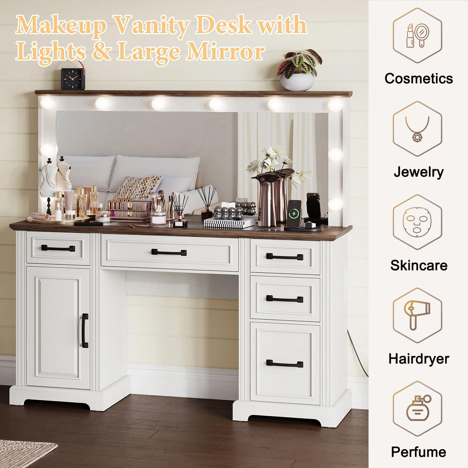 YUMPIE 55”Farmhouse Vanity Desk with Large Mirror & Lights, Glass Top Large Makeup Vanity Table with 10 Hollywood Lights Bulbs, Charging Station, 5 Drawers, Dressing Table for Bedroom, Rustic White