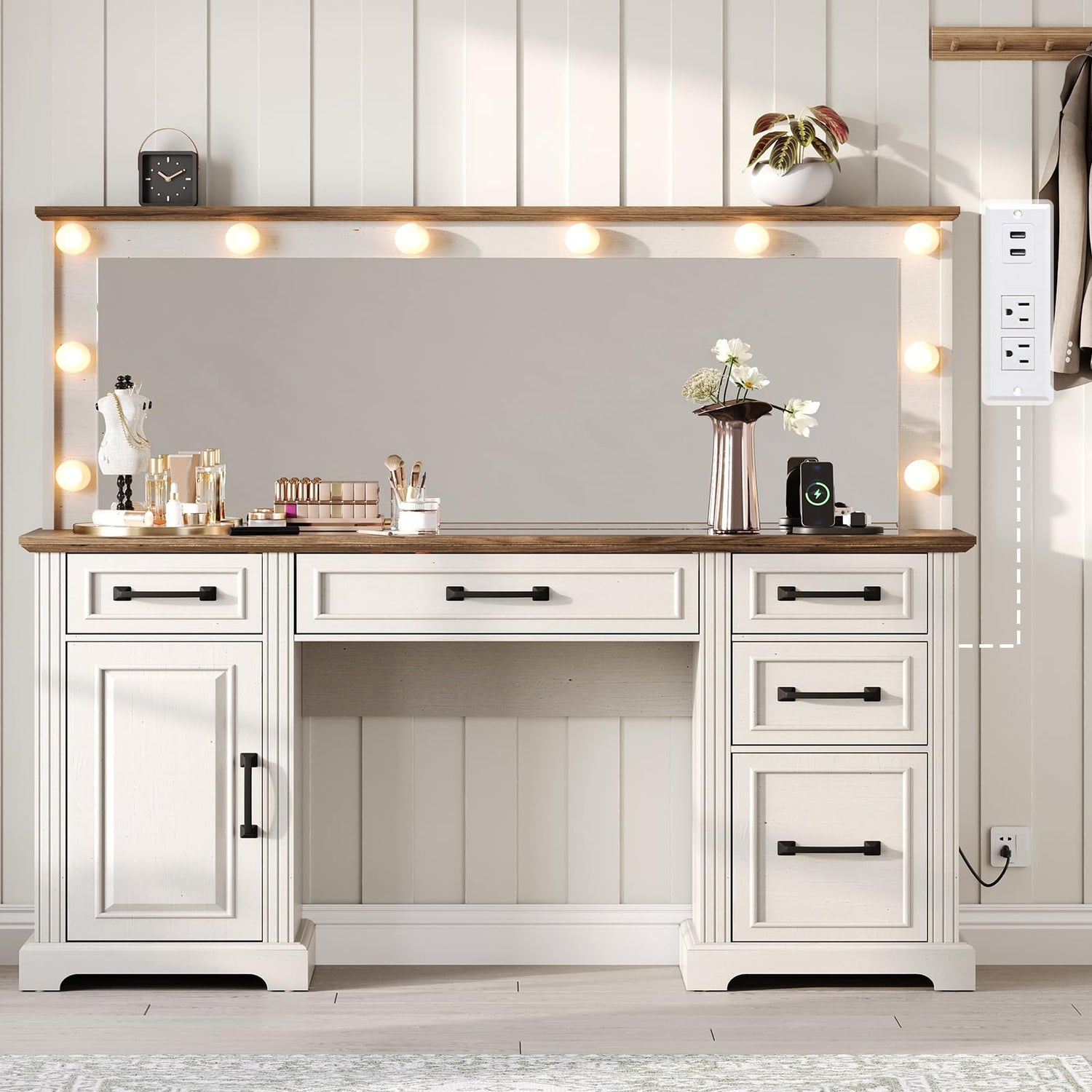 - Elegant & Functional: Enhance your beauty with the 55” farmhouse vanity desk. Featuring a large mirror with 10 Hollywood lights, a sleek glass top, 5 spacious drawers, and a built-in charging station, perfect for organizing makeup essentials