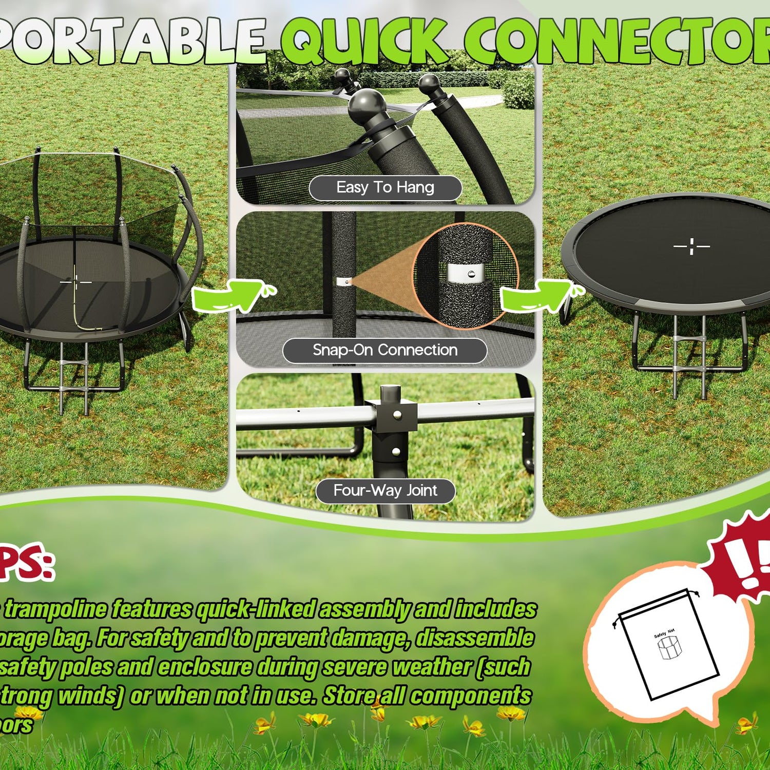 - Easy to install: Designed for easy installation, 10 ft trampoline features a sturdy four-way joint for added stability. The poles connect with a simple snap-on system, requiring no complex tools. Clear step-by-step instructions ensure a quick and efficient setup.