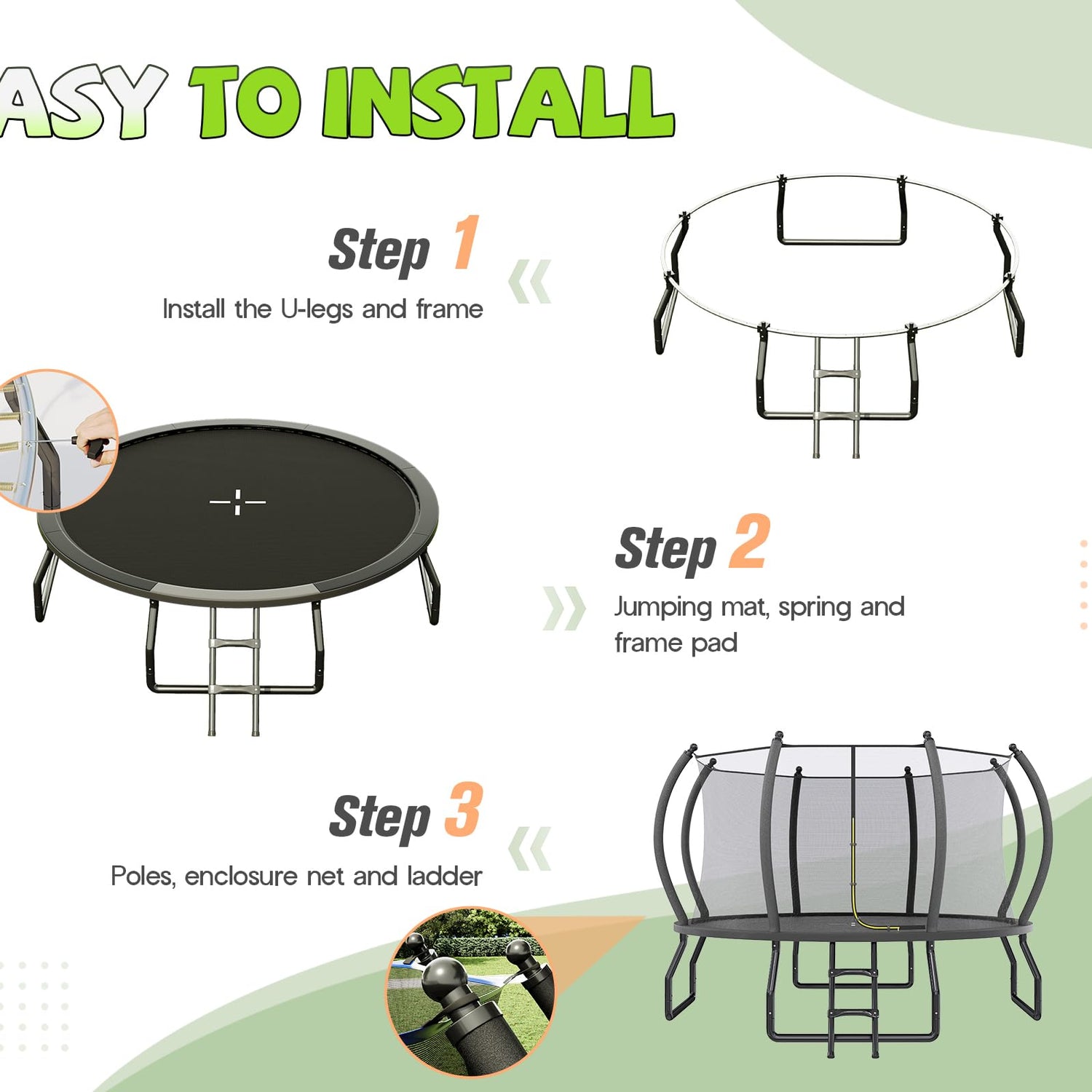 - Easy to Install: Designed for easy installation, 14 ft trampoline features a sturdy four-way joint for added stability. The poles connect with a simple snap-on system, requiring no complex tools. Clear step-by-step instructions ensure a quick and efficient setup
