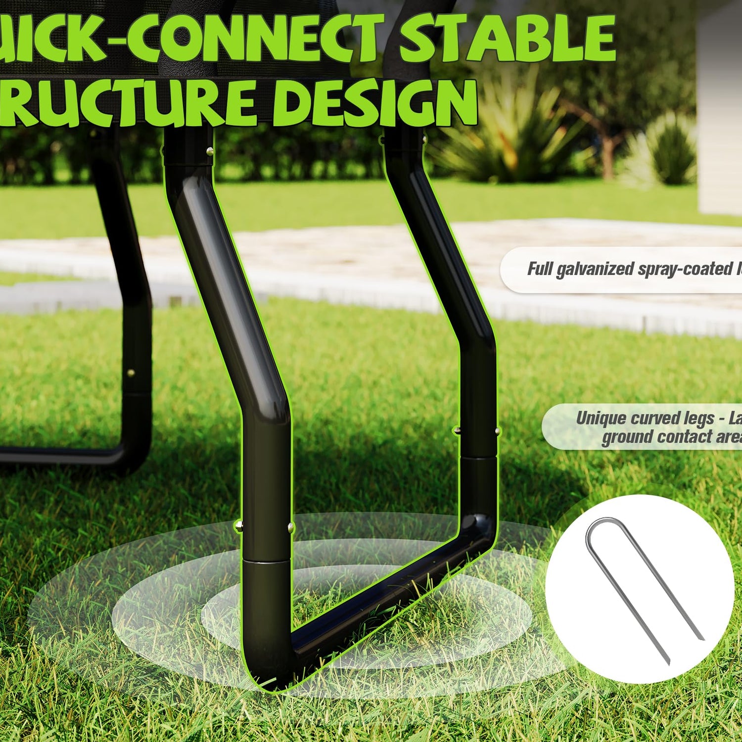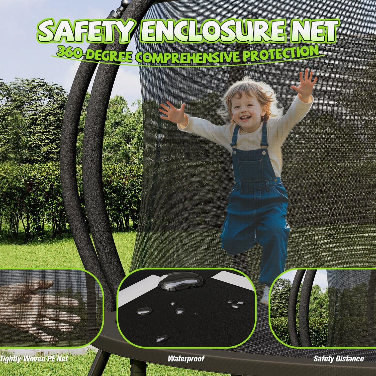 - Safe Jump: Our outdoor trampoline meets ASTM F381-16 safety standards. Eight outward-curved trampoline poles wrapped in pearl cotton effectively prevent collisions with hard surfaces, ensuring a safe environment for children to enjoy trampoline fun