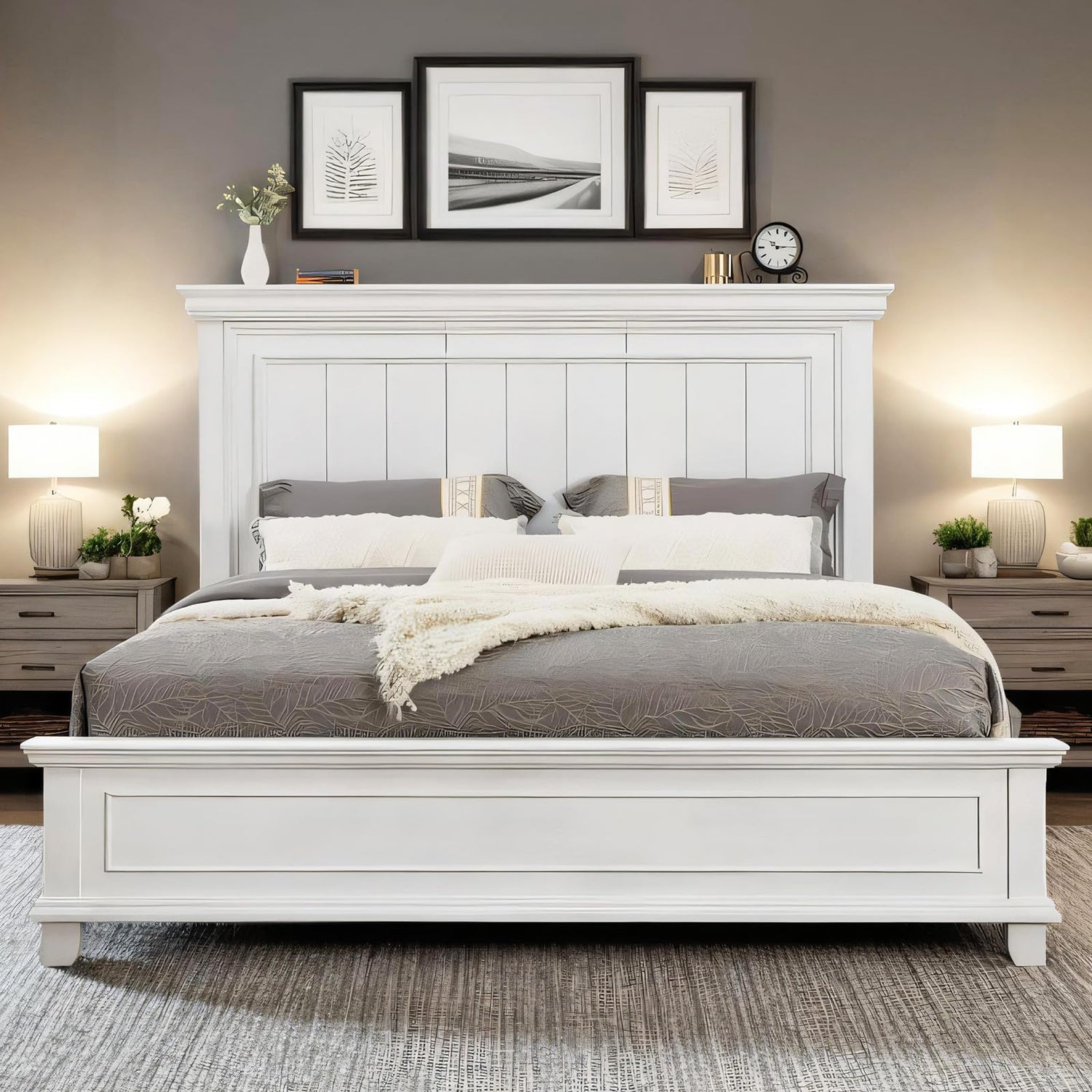 YUMPIE Farmhouse King Size Wood Bed Frame with Headboard and Footboard, No Box Spring Needed, Rustic Platform Bed with 12 Wood Slats Support, Distressed White
