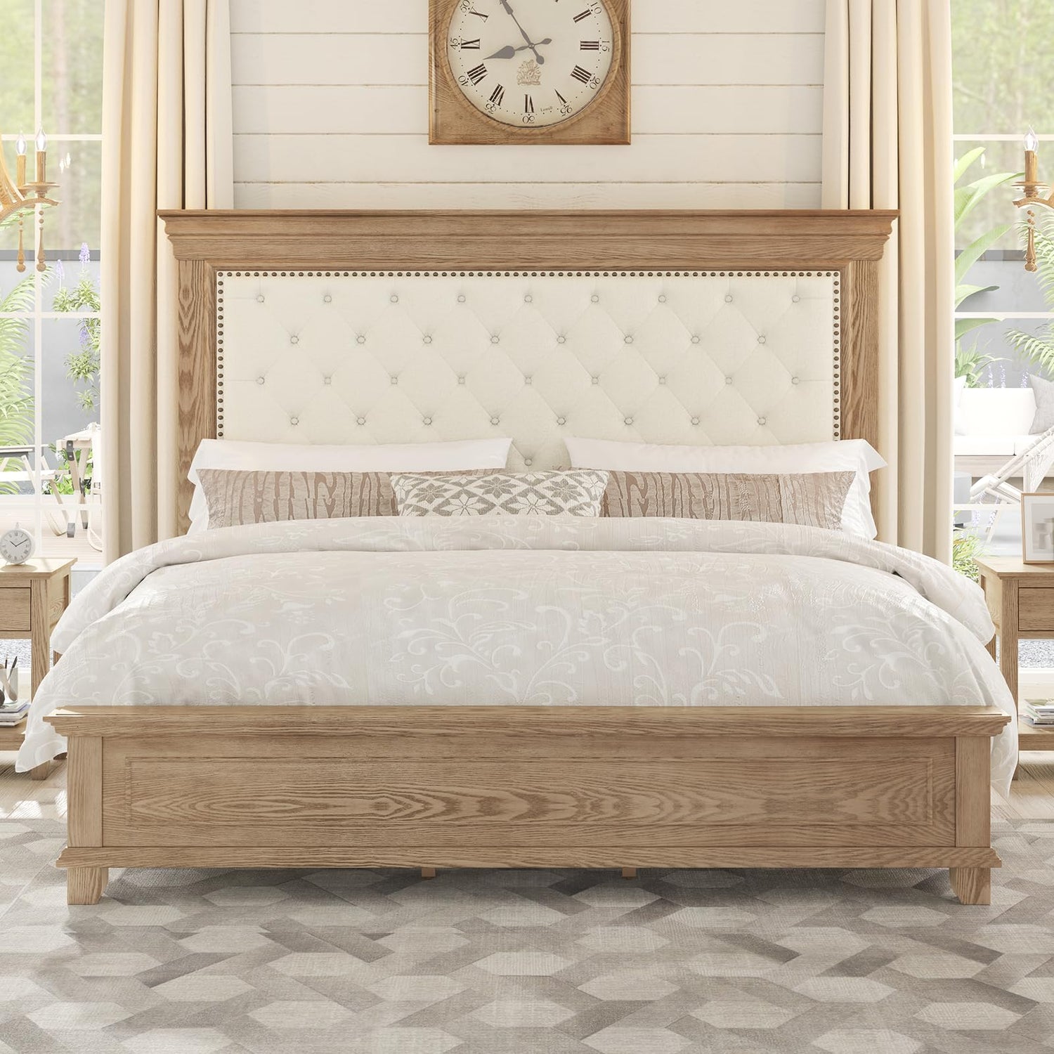 - [Exquisite Rustic Farmhouse Charm] Crafted with heavy crown molding railing & chenille fabric, a weathered antique wood grain finish perfect blend of classic & modern styles, button tufted & antique brass nail heads add an elegant touch to your room