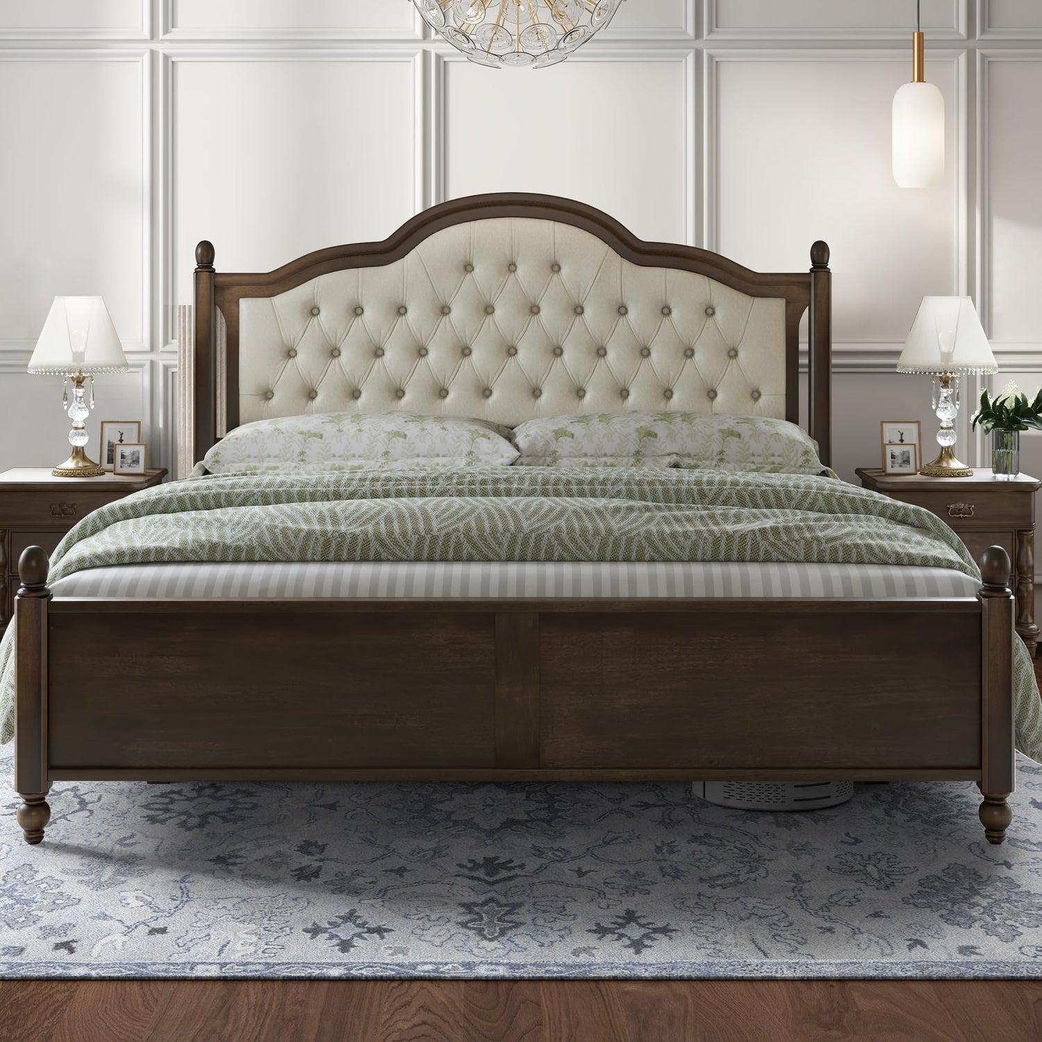 YUMPIE Solid Wood King Bed Frame, Transitional Platform Bed with 52.5" Tufted Upholstered Headboard, Rubberwood Construction, Roman Column Accents, No Box Spring Needed